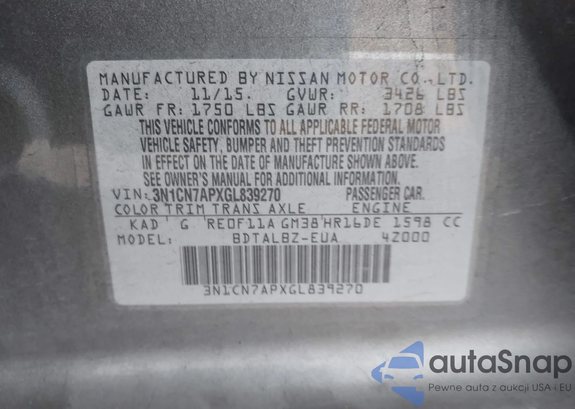 • VIN 3N1CN7APXGL839270
