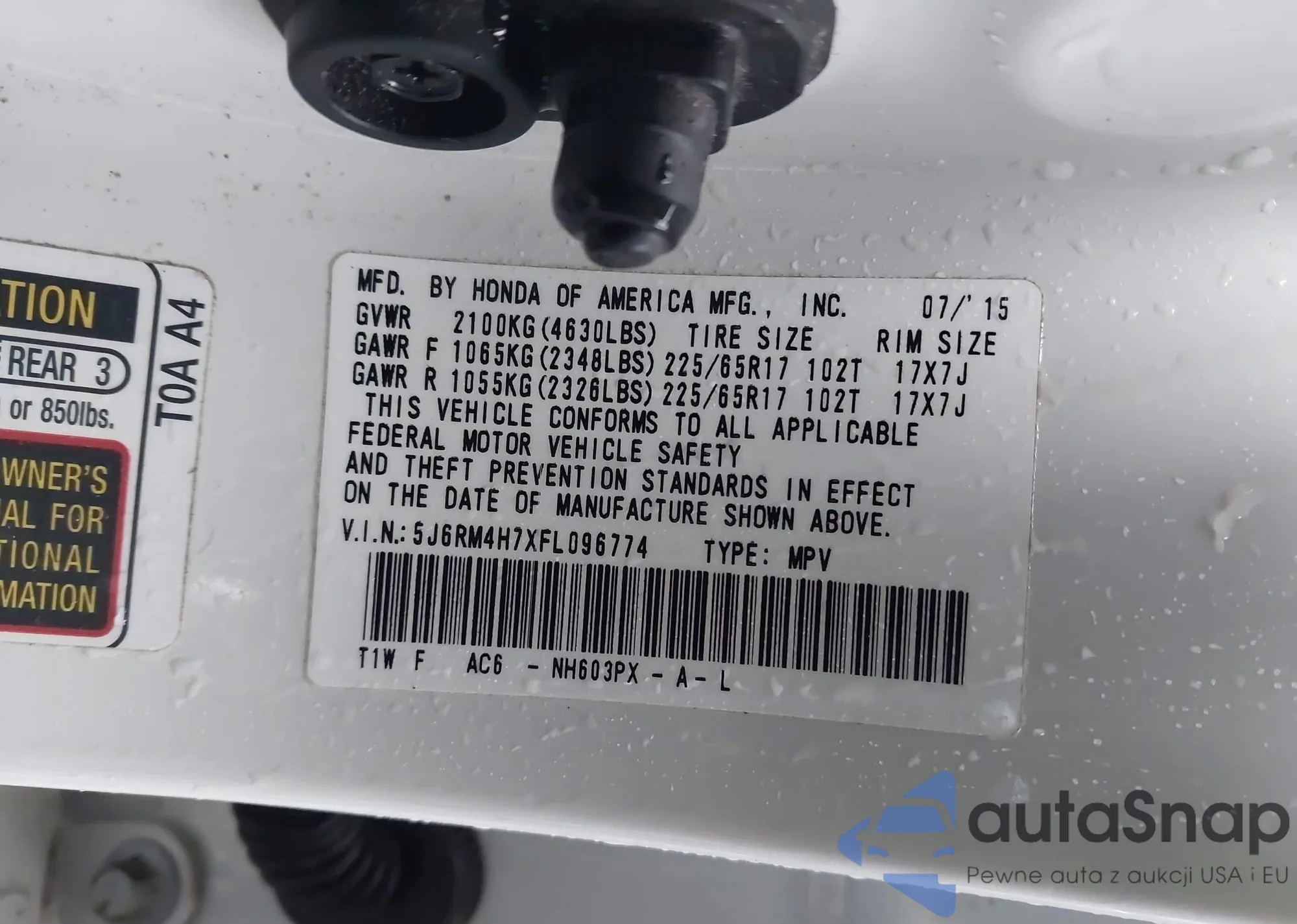 • VIN 5J6RM4H7XFL096774