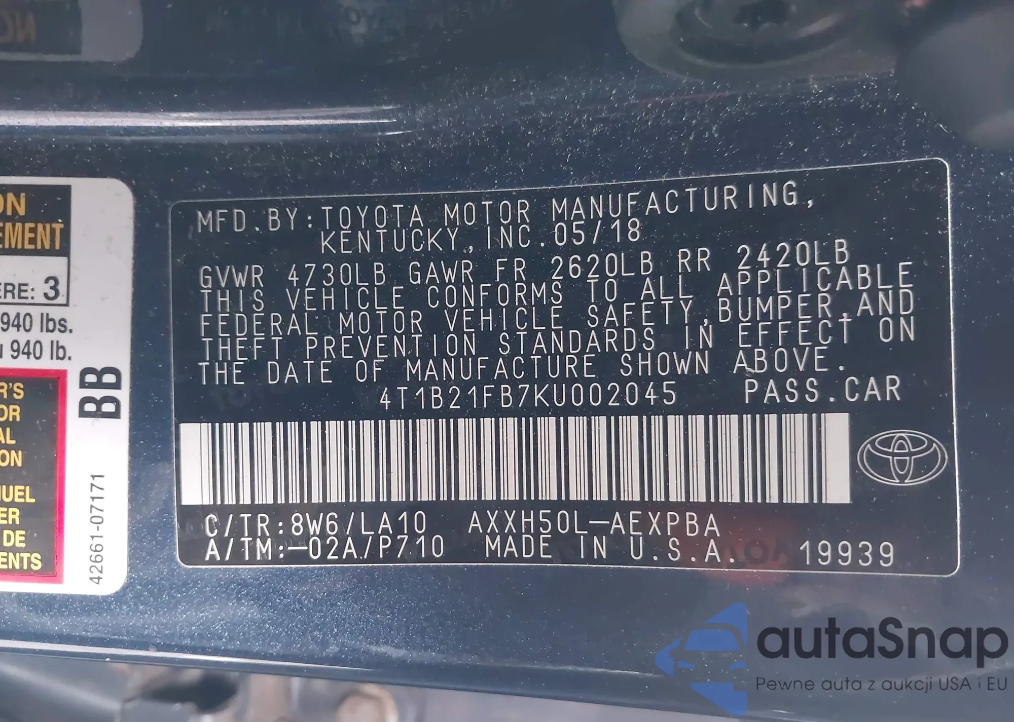 • VIN 4T1B21FB7KU002045