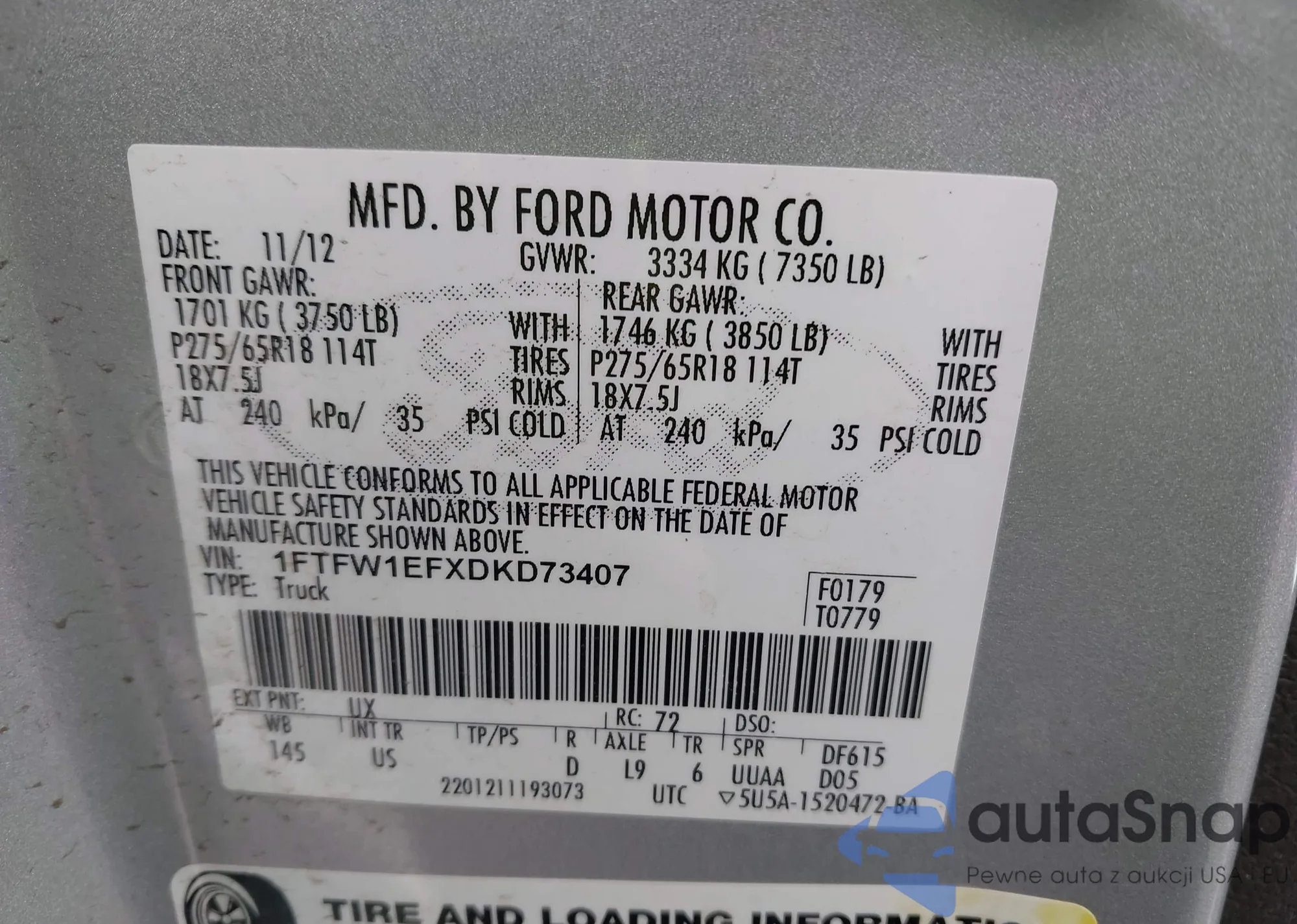 LOT: 43957315 VIN: 1FTFW1EFXDKD73407