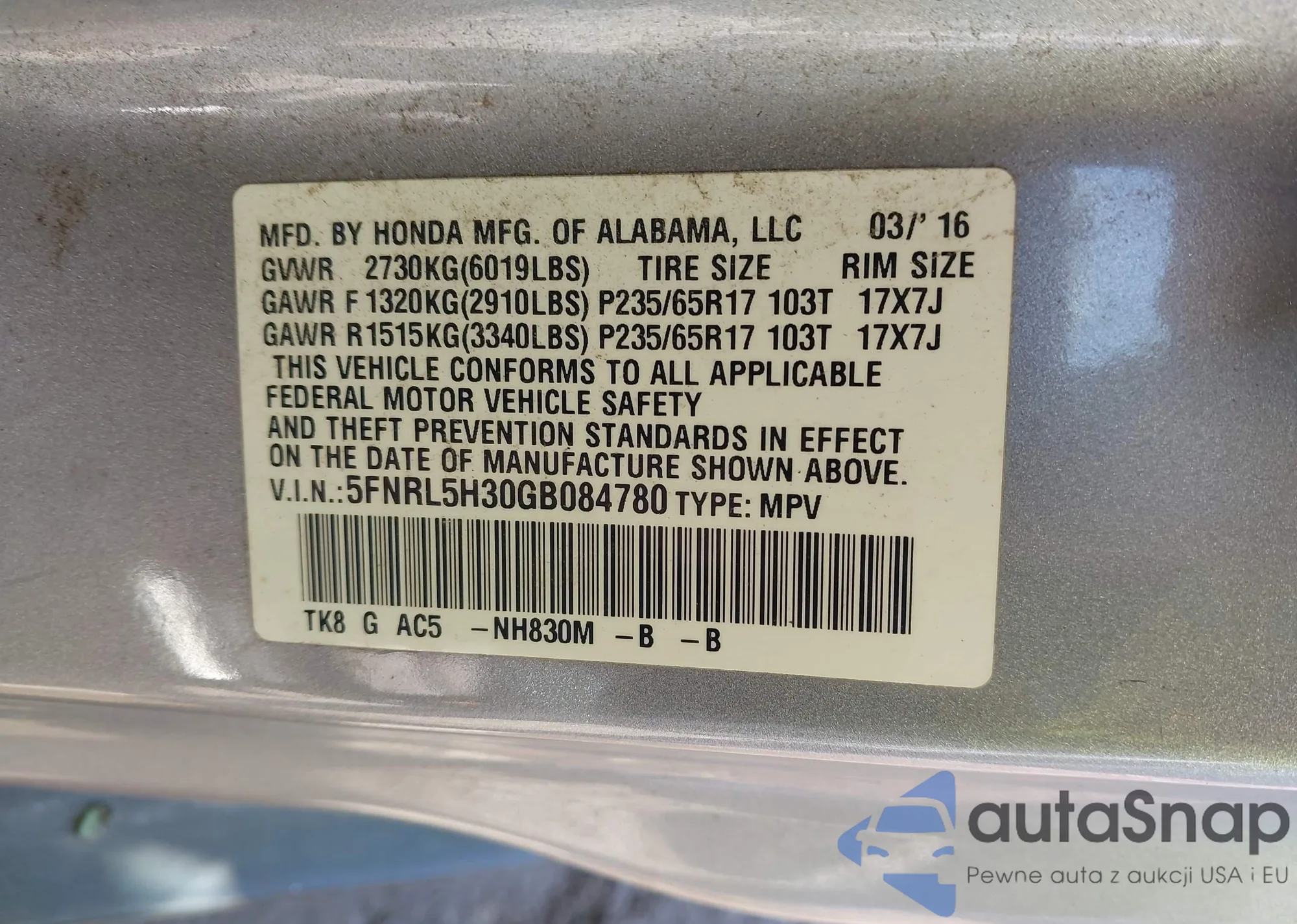 • VIN 5FNRL5H30GB084780