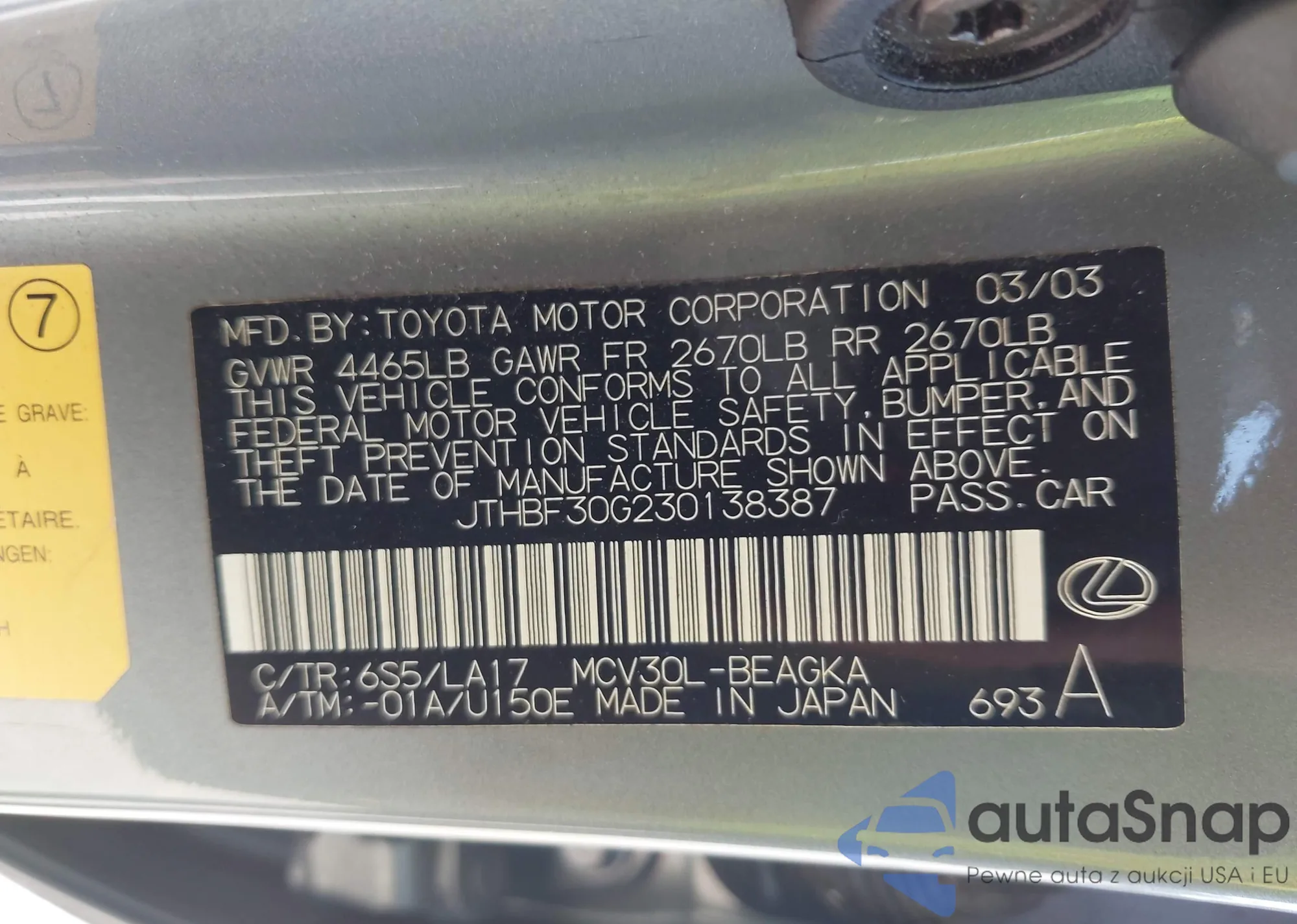 LOT: 43903364 VIN: JTHBF30G230138387