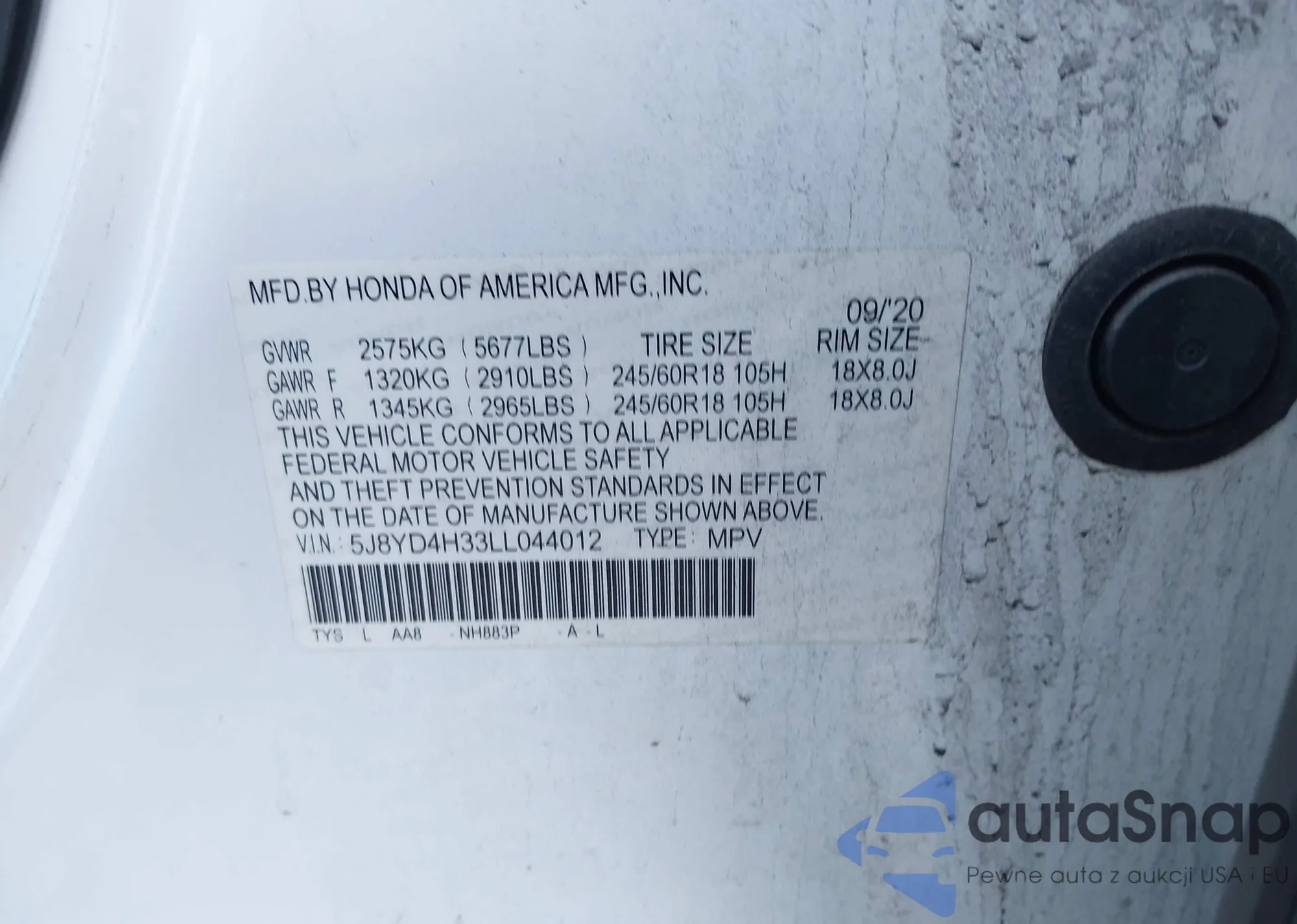 LOT: 43729658 VIN: 5J8YD4H33LL044012
