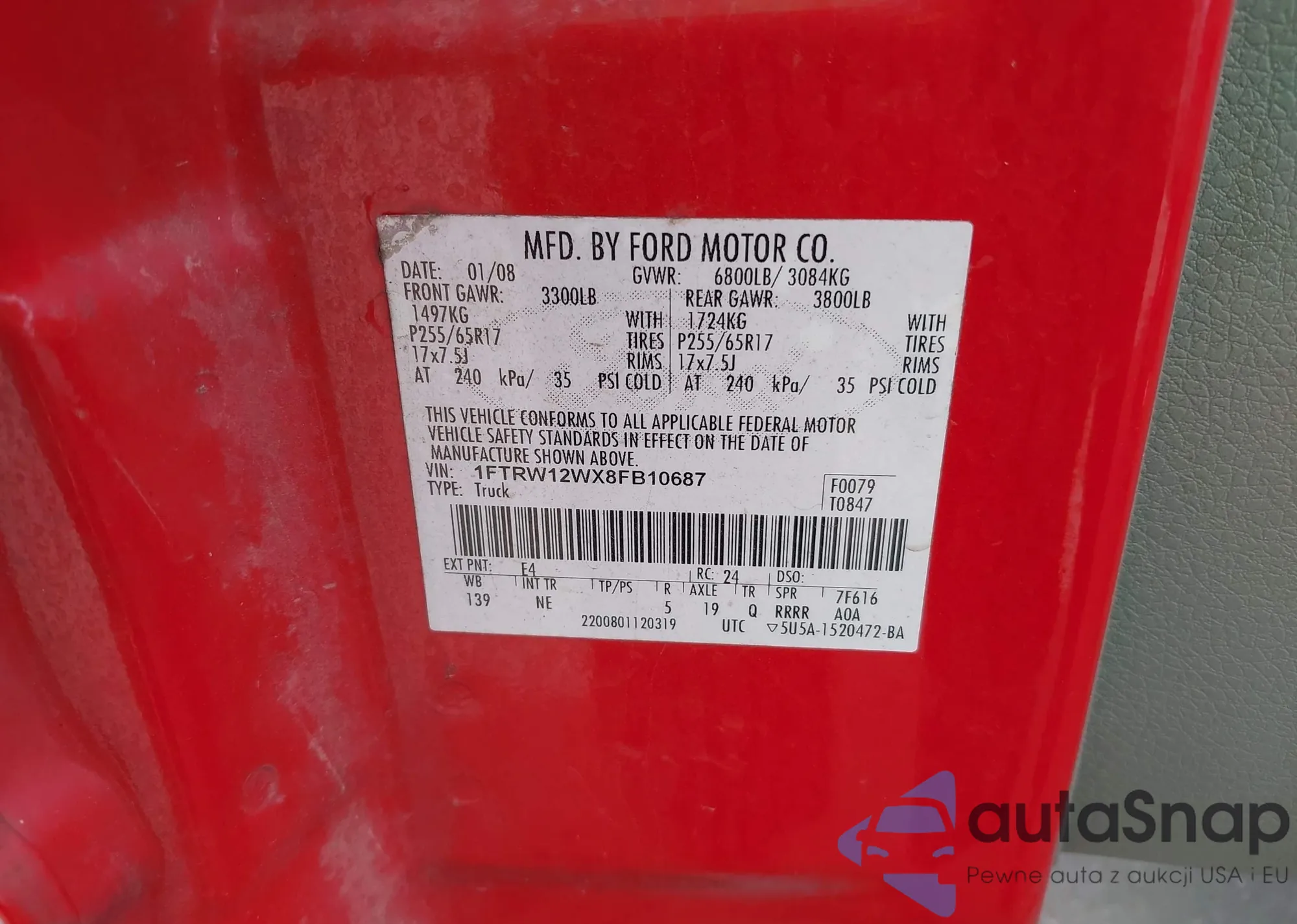 • VIN 1FTRW12WX8FB10687