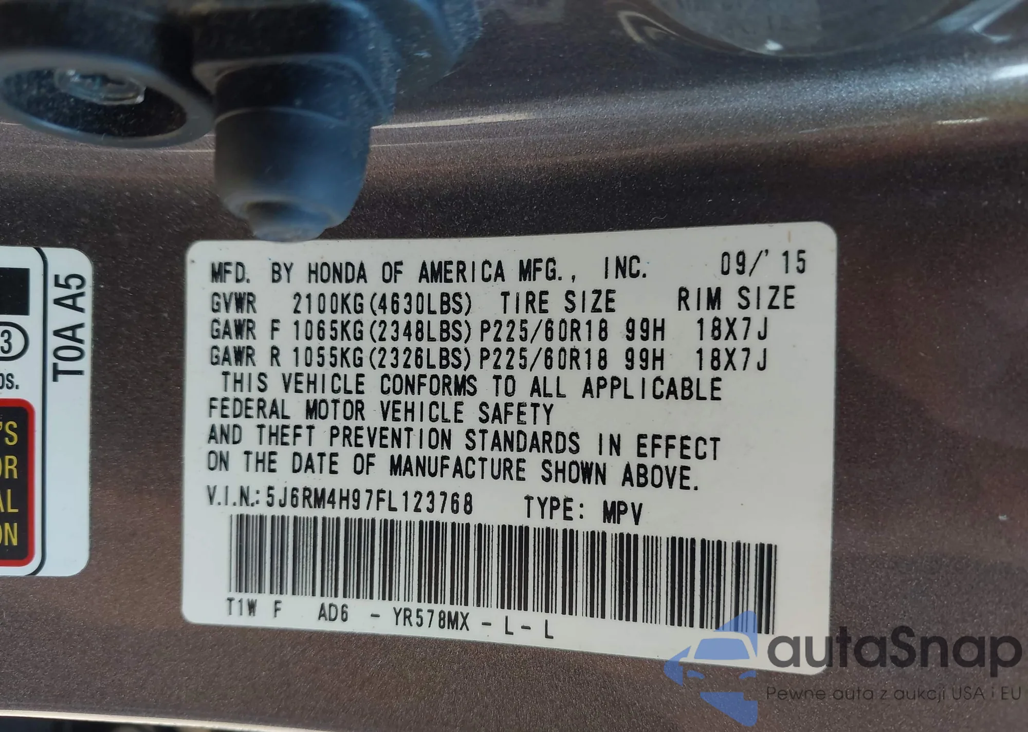 • VIN 5J6RM4H97FL123768