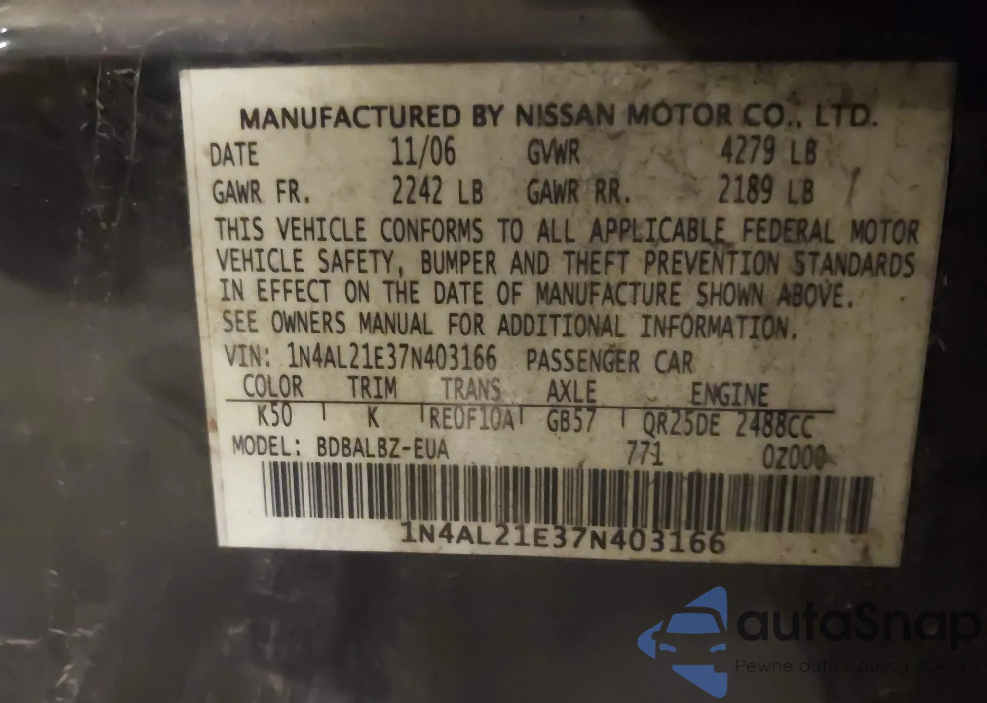 LOT: 43611238 VIN: 1N4AL21E37N403166