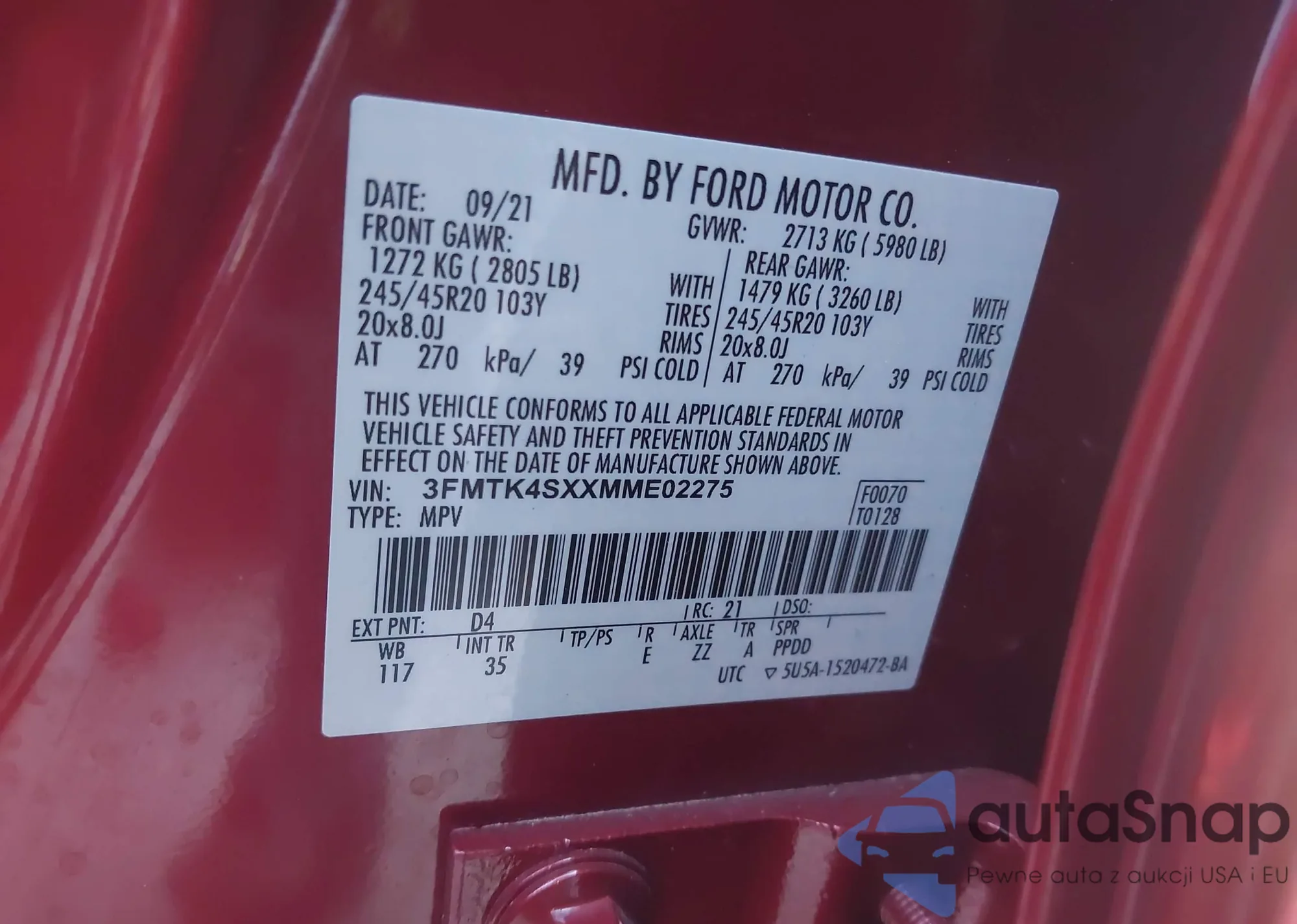 LOT: 43532773 VIN: 3FMTK4SXXMME02275