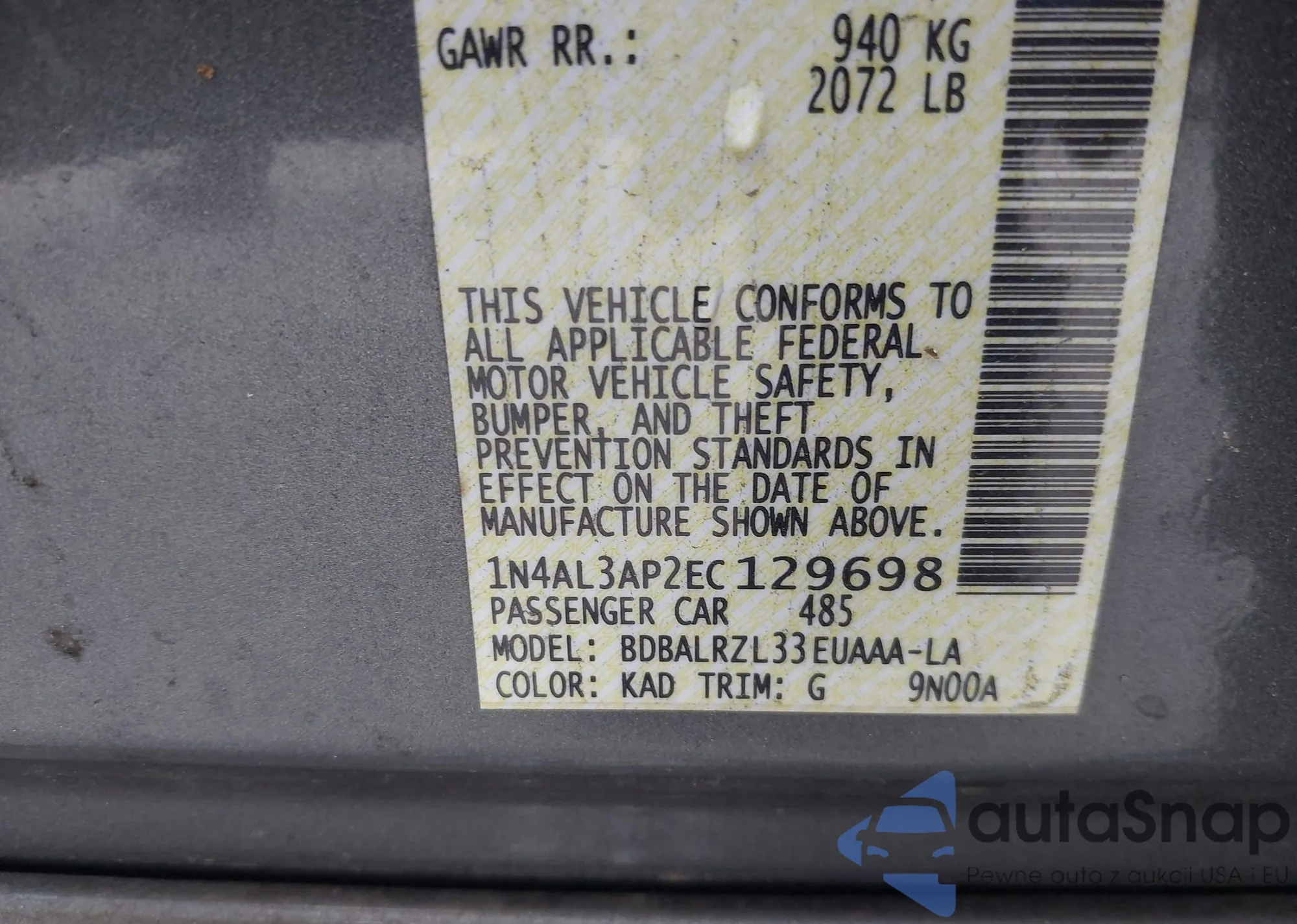 • VIN 1N4AL3AP2EC129698