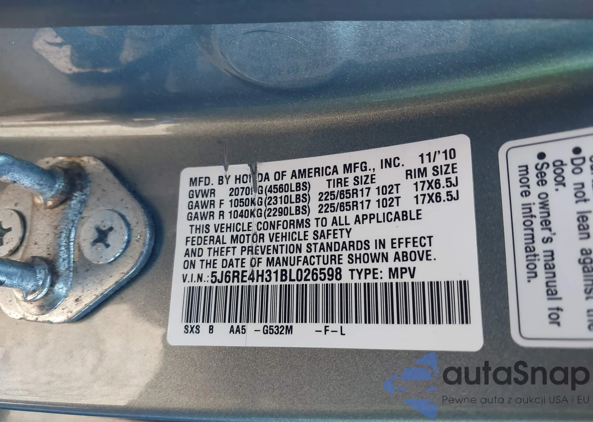 • VIN 5J6RE4H31BL026598