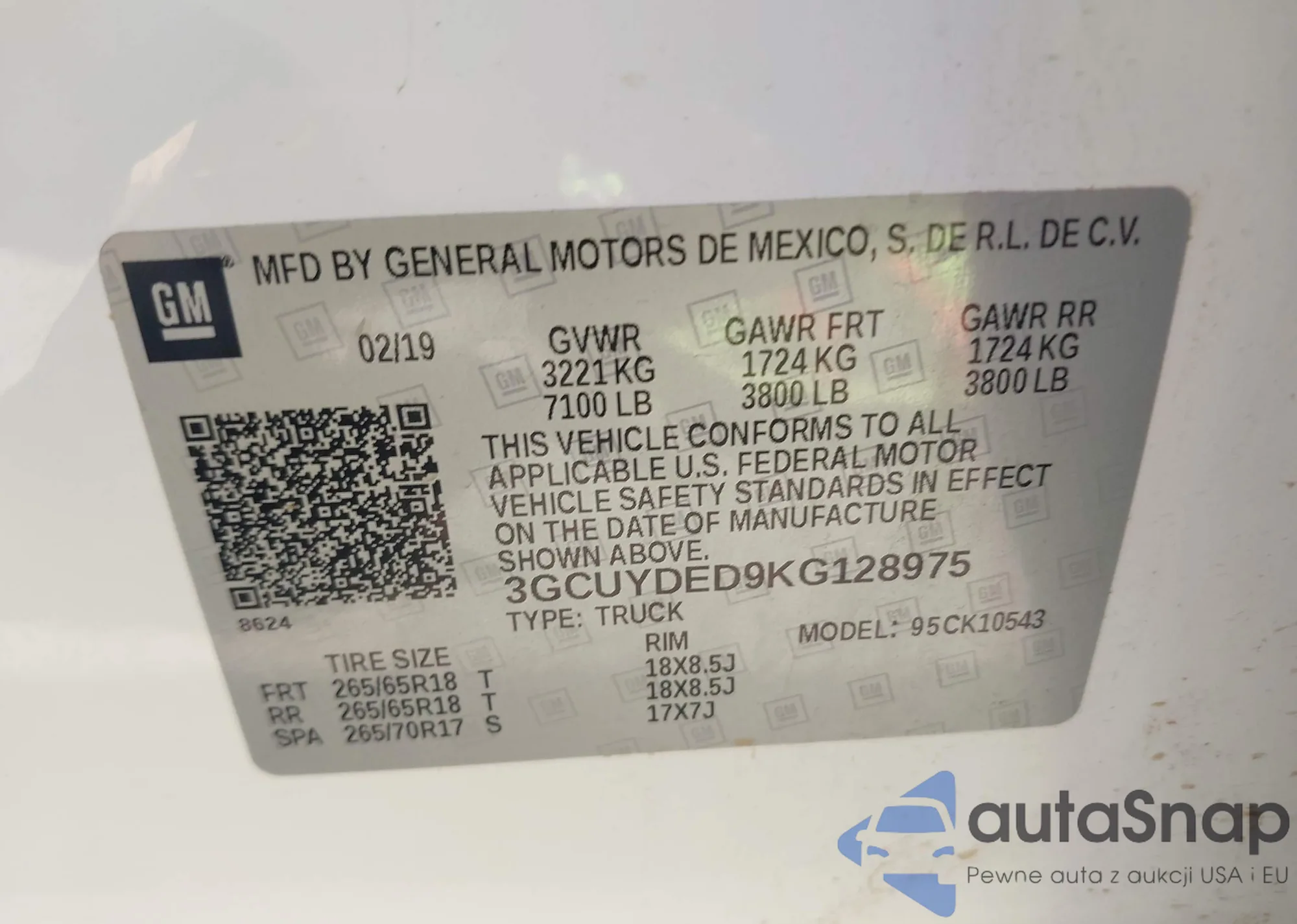 LOT: 43665485 VIN: 3GCUYDED9KG128975