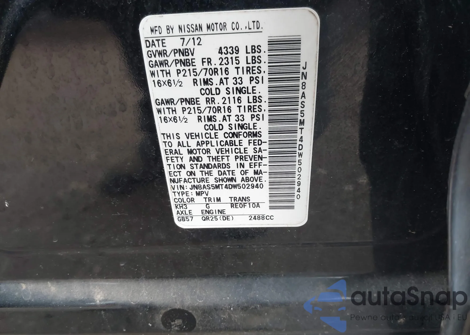 • VIN JN8AS5MT4DW502940