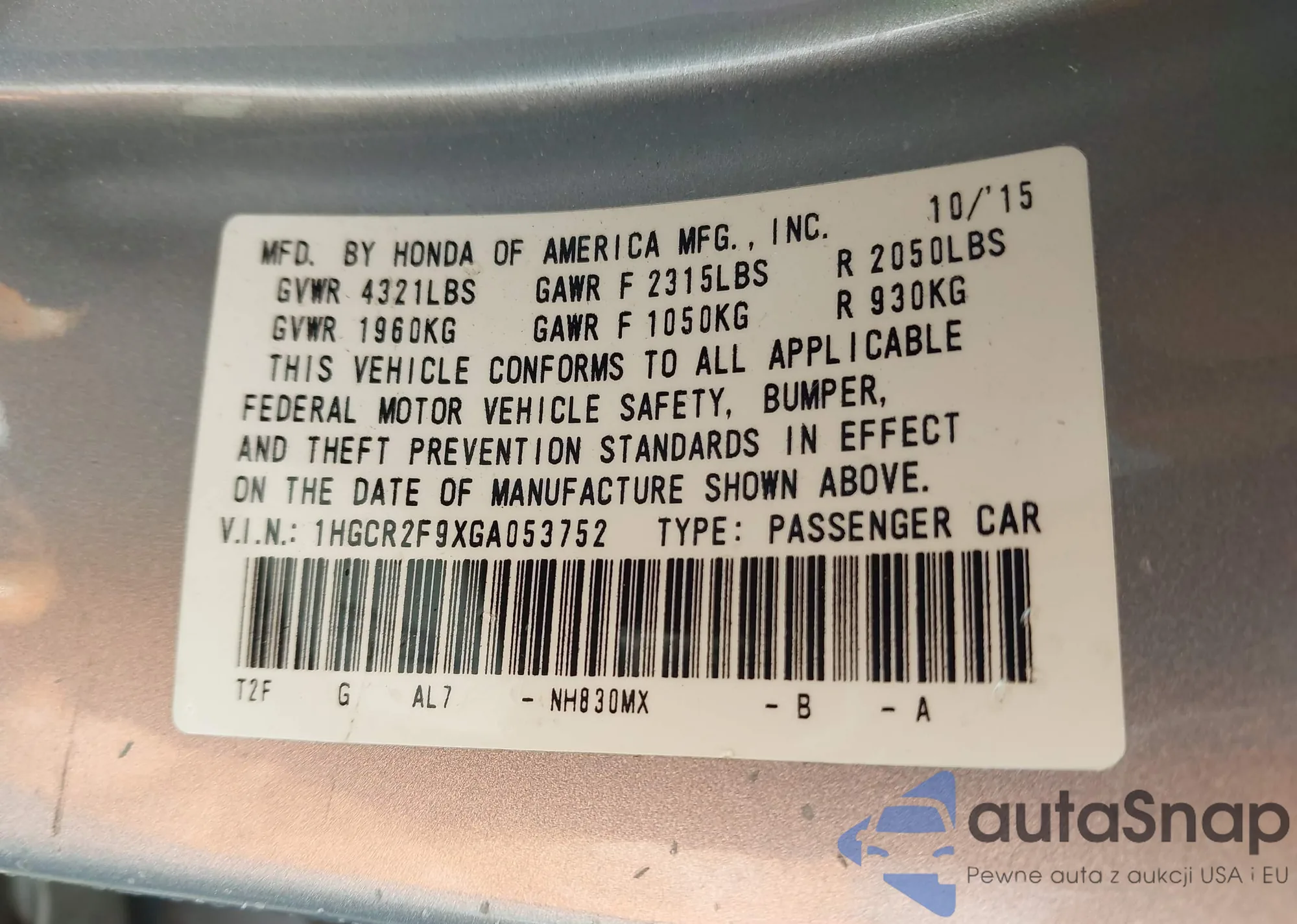 • VIN 5FNYF5H53MB032415