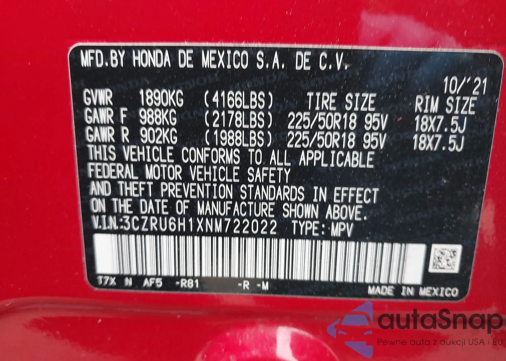 • VIN 3CZRU6H1XNM722022