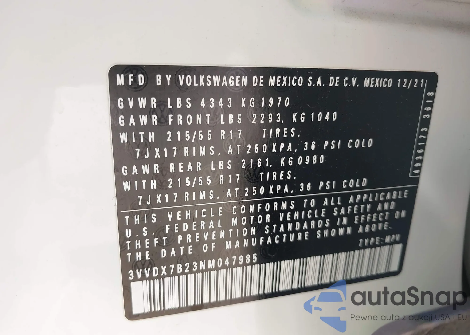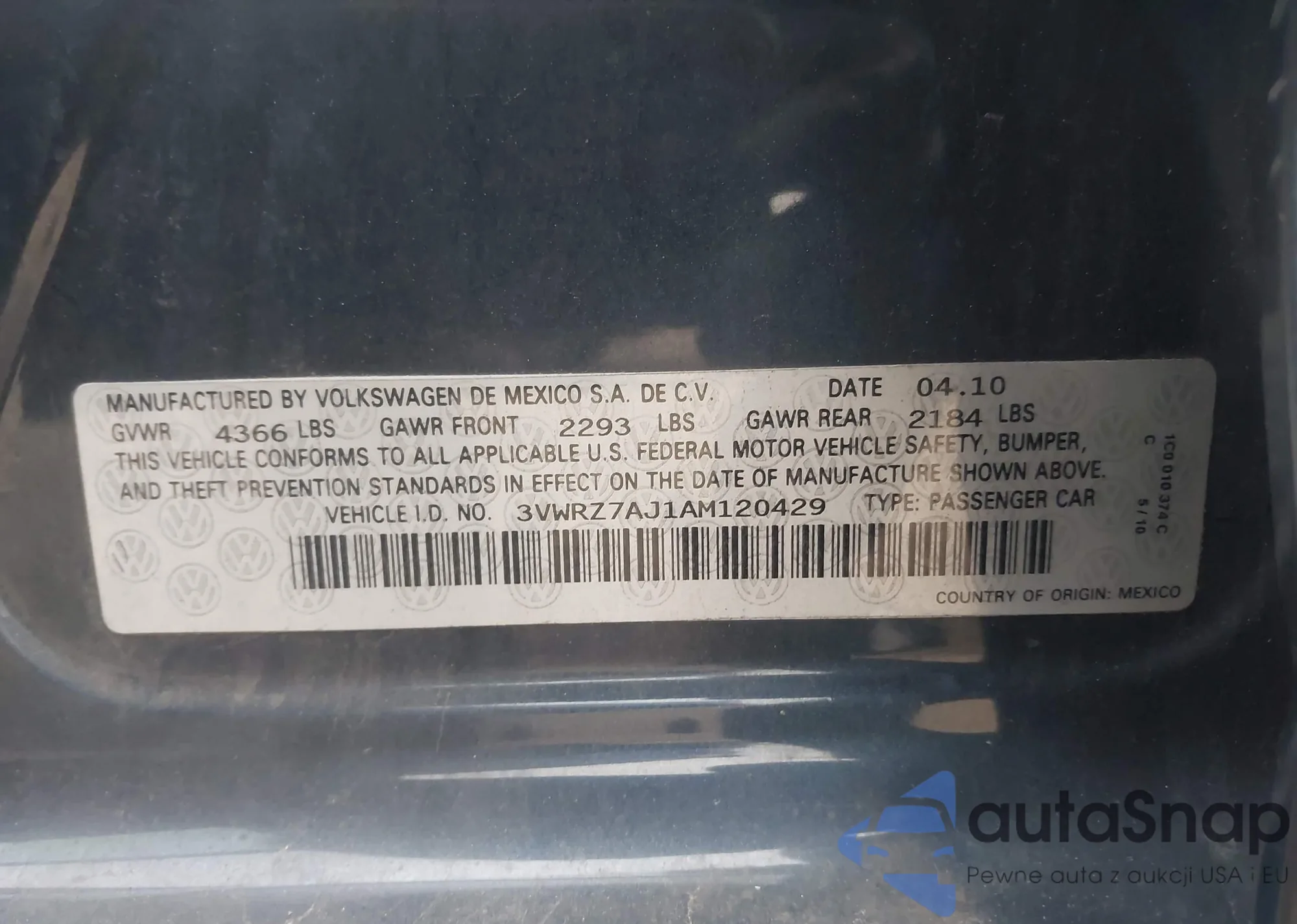 • VIN 3VWRZ7AJ1AM120429