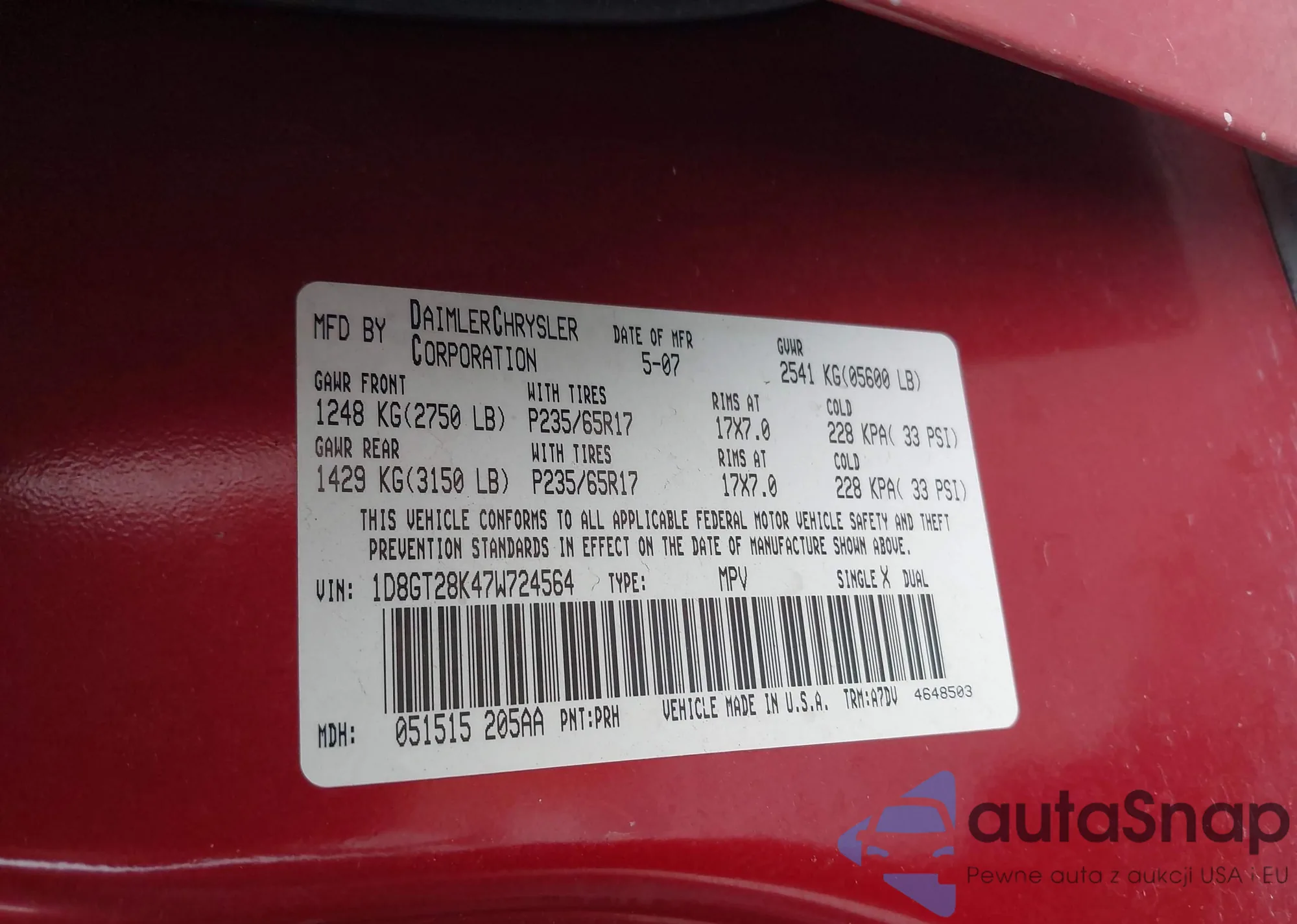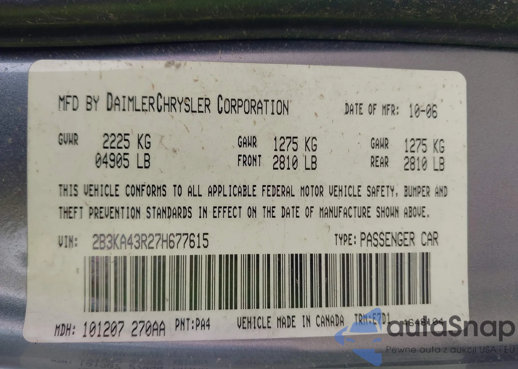 • VIN 2B3KA43R27H677615