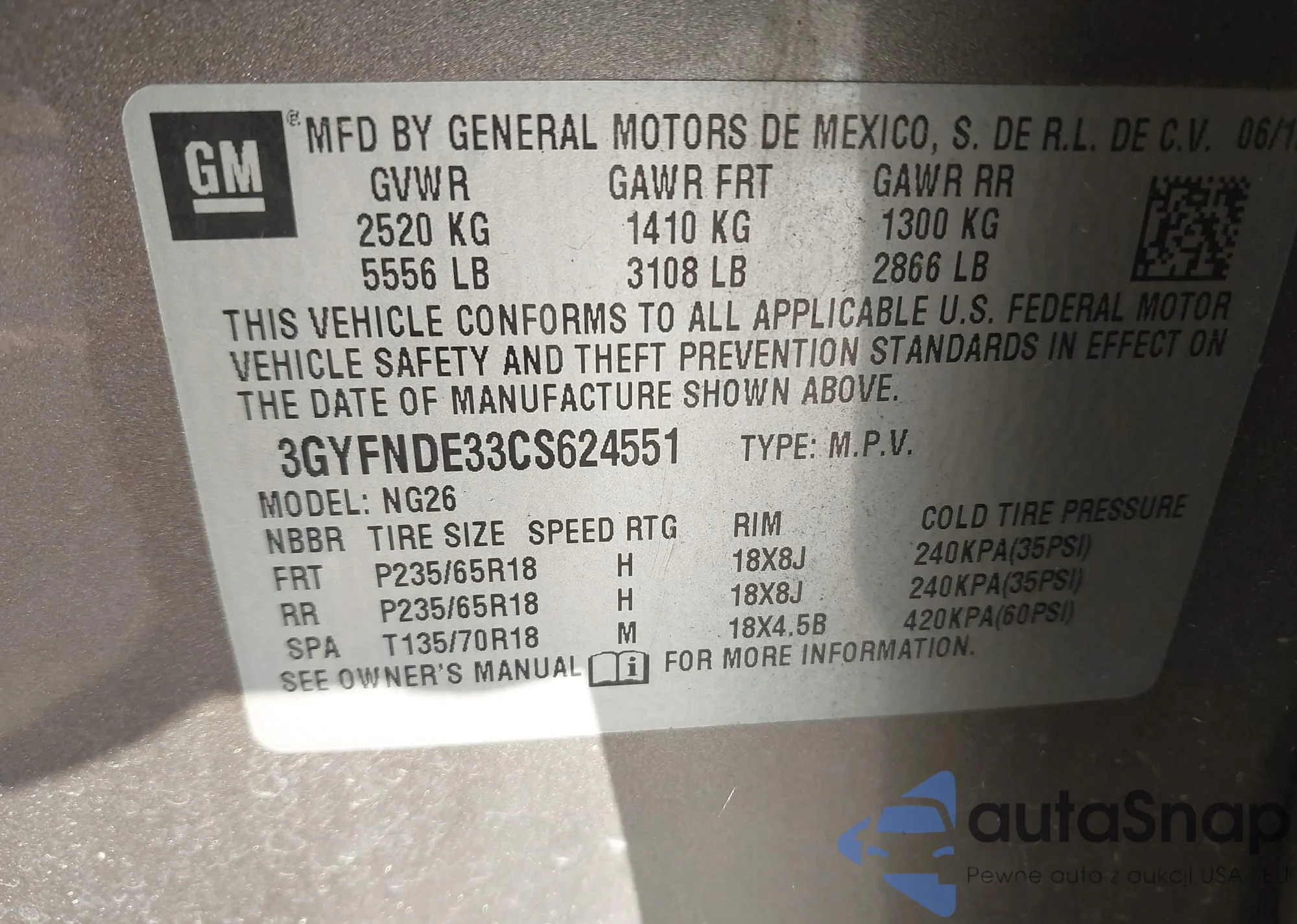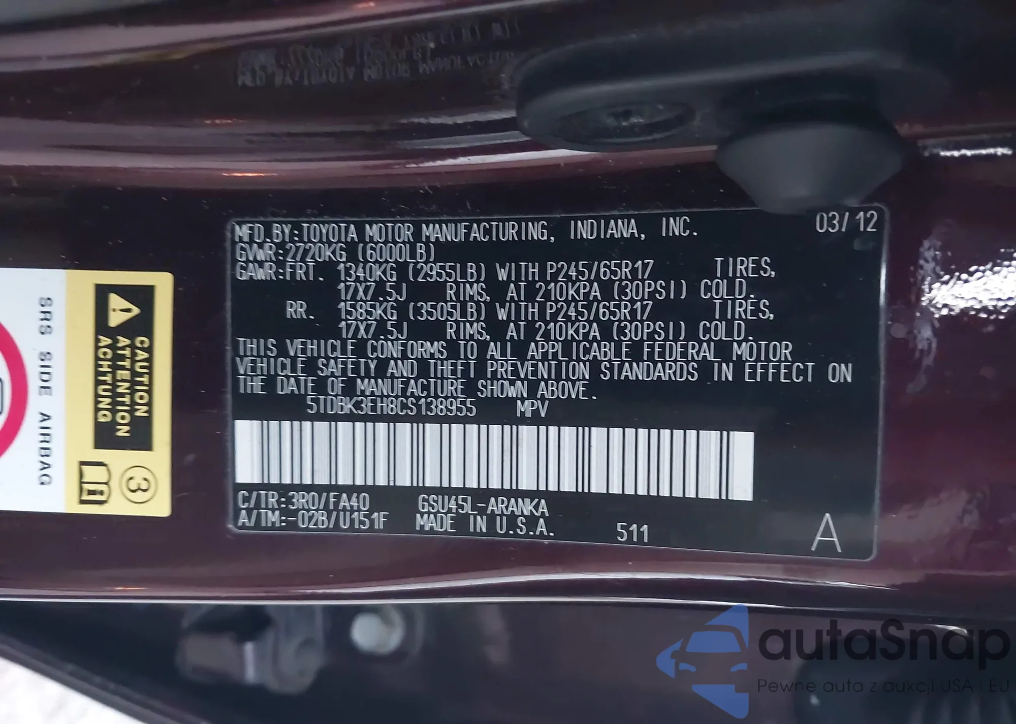 LOT: 43714533 VIN: 5TDBK3EH8CS138955
