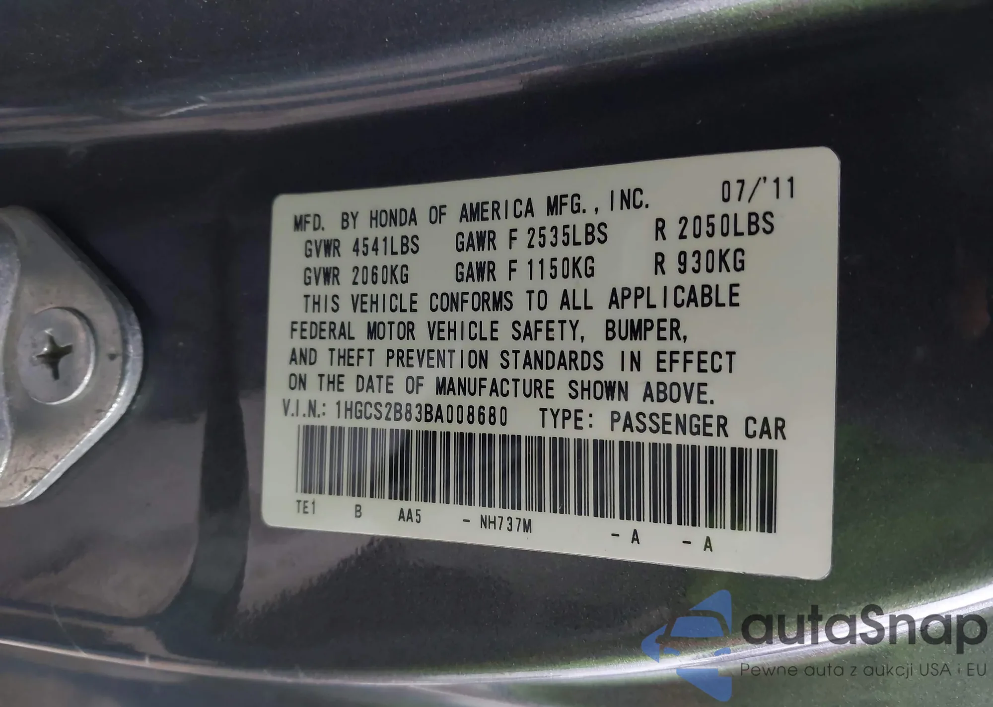 LOT: 43639536 VIN: 1HGCS2B83BA008680