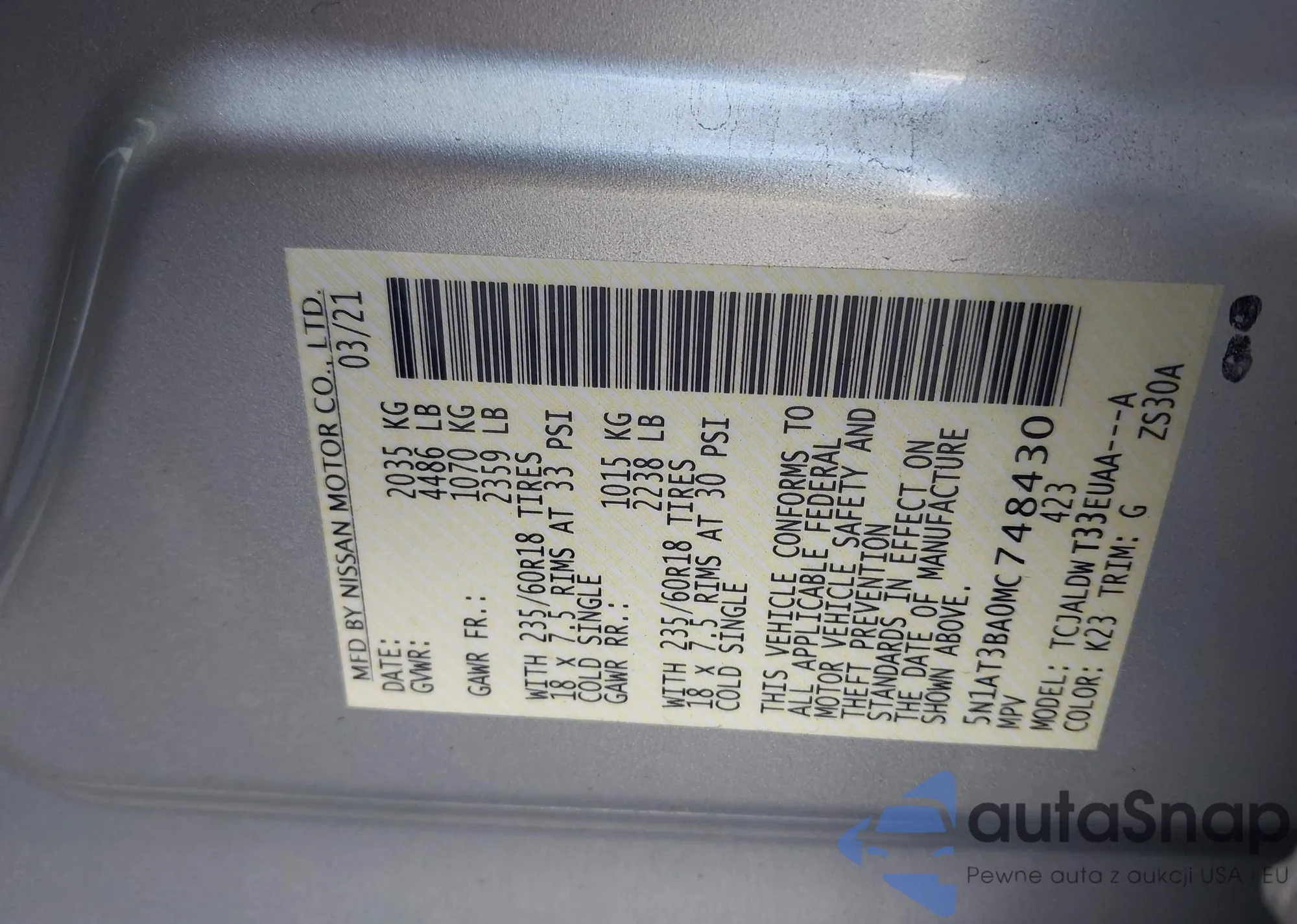 • VIN 5N1AT3BA0MC748430