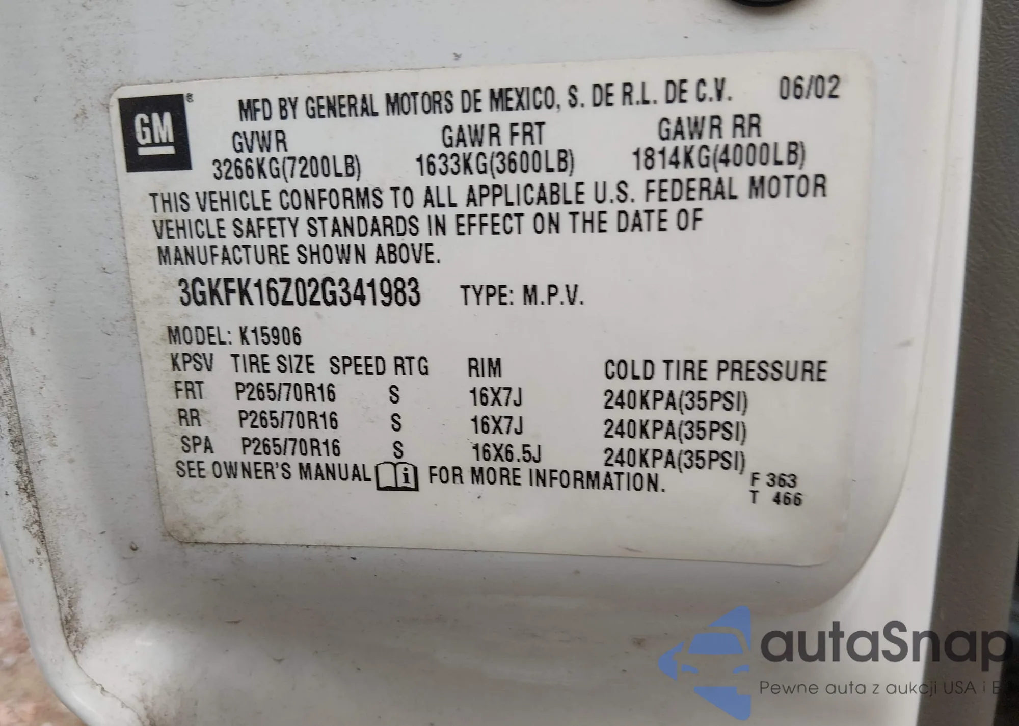 • VIN 3GKFK16Z02G341983
