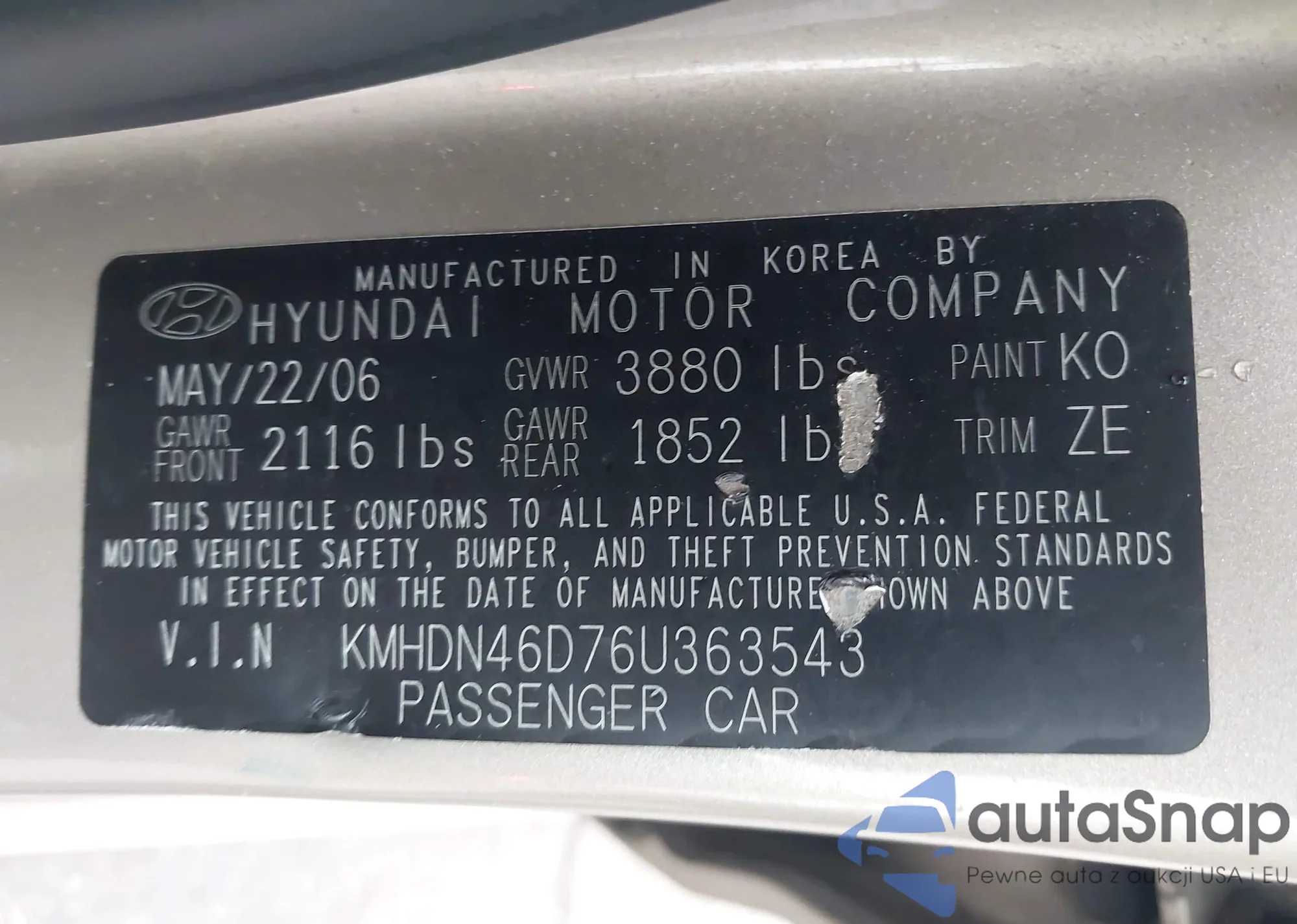LOT: 43921317 VIN: KMHDN46D76U363543