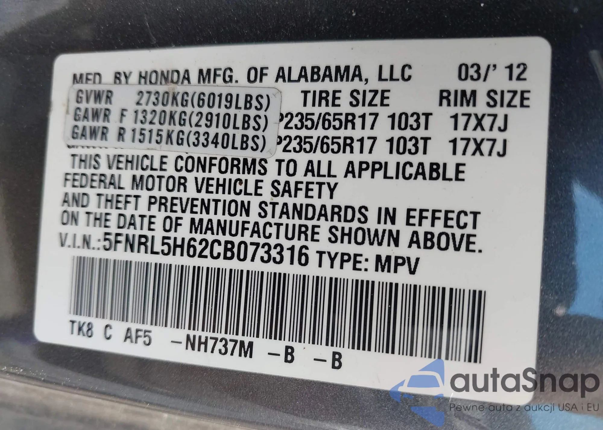 • VIN 5J6RW2H80MA016916