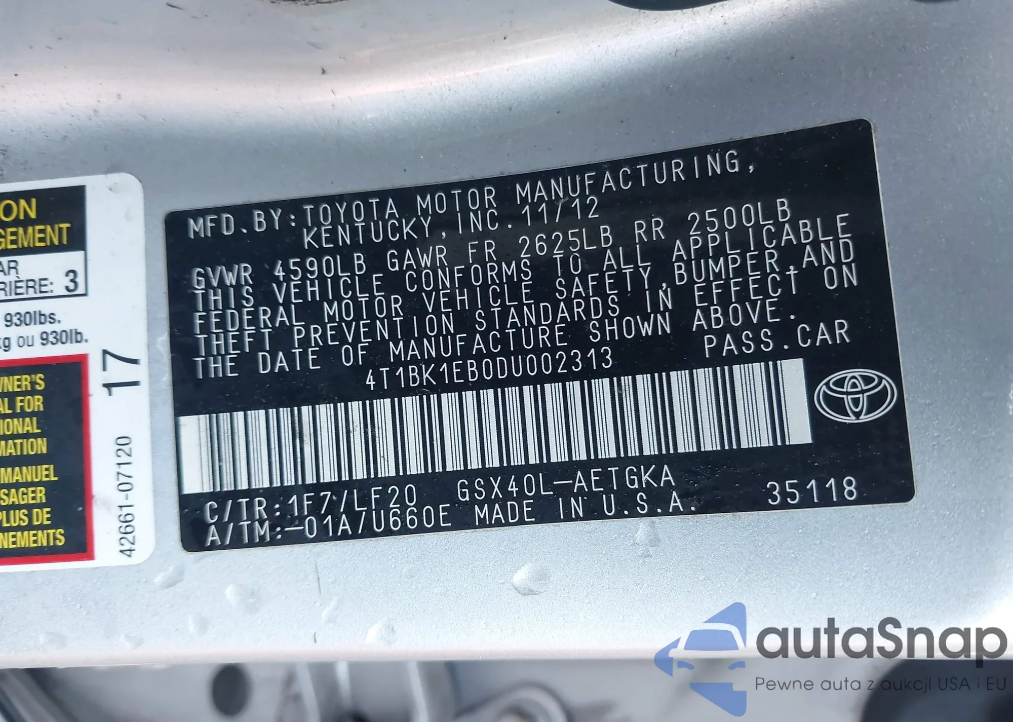 LOT: 43864985 VIN: 4T1BK1EB0DU002313