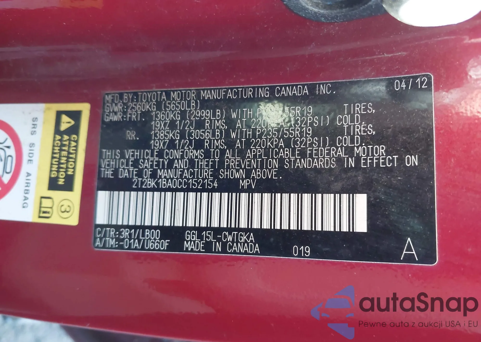 • VIN 2T2BK1BA0CC152154