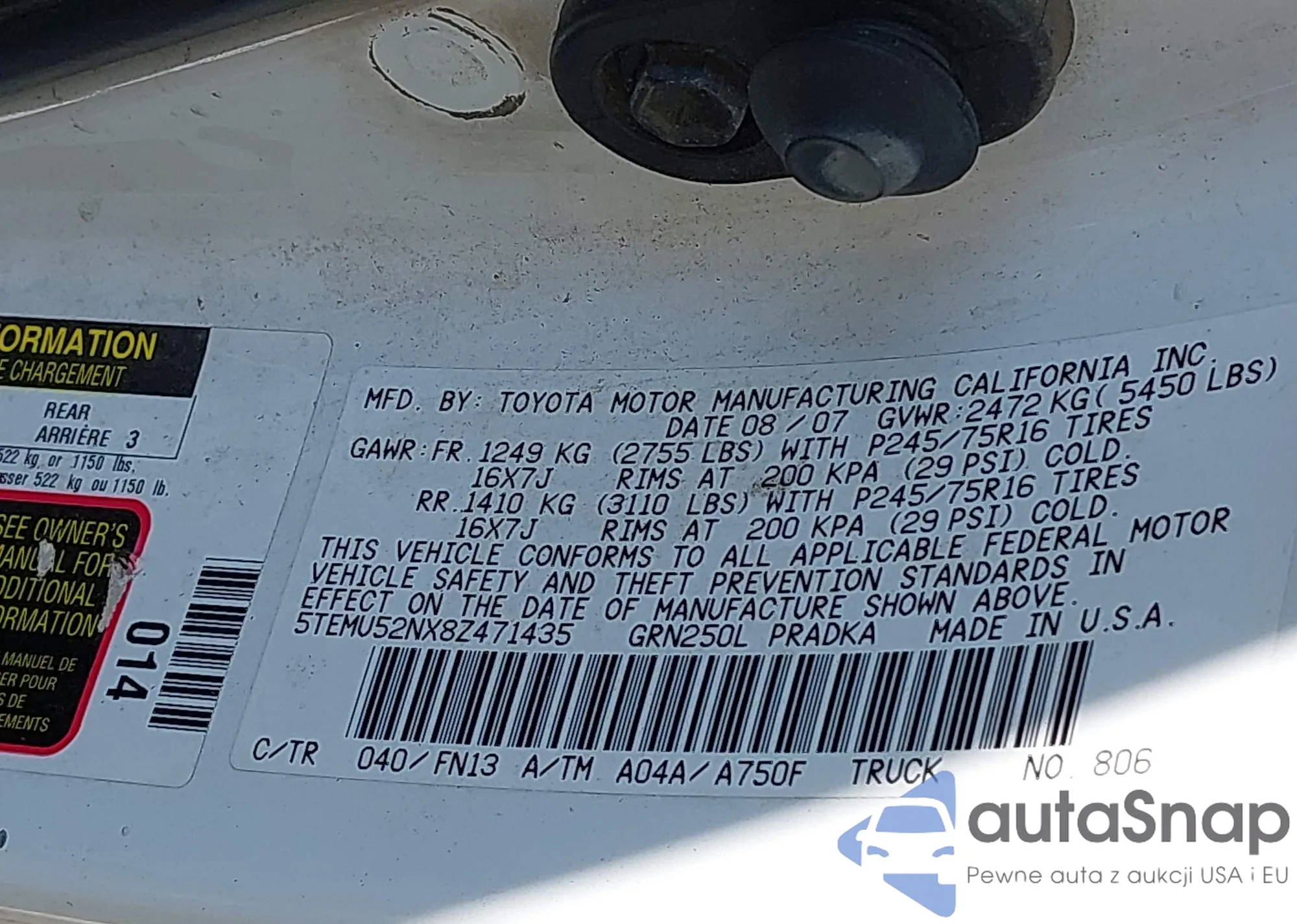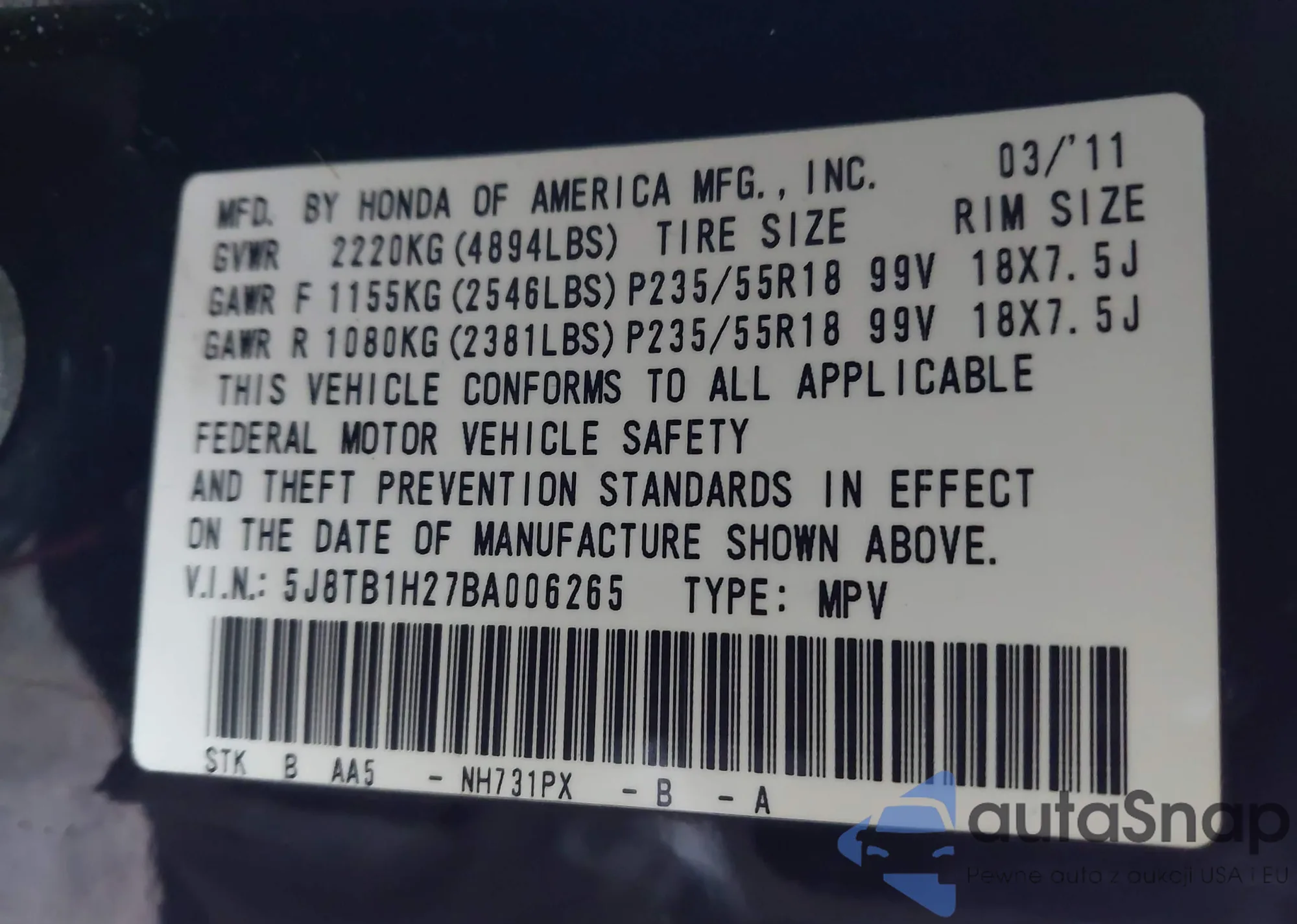 • VIN 5J8TB1H27BA006265