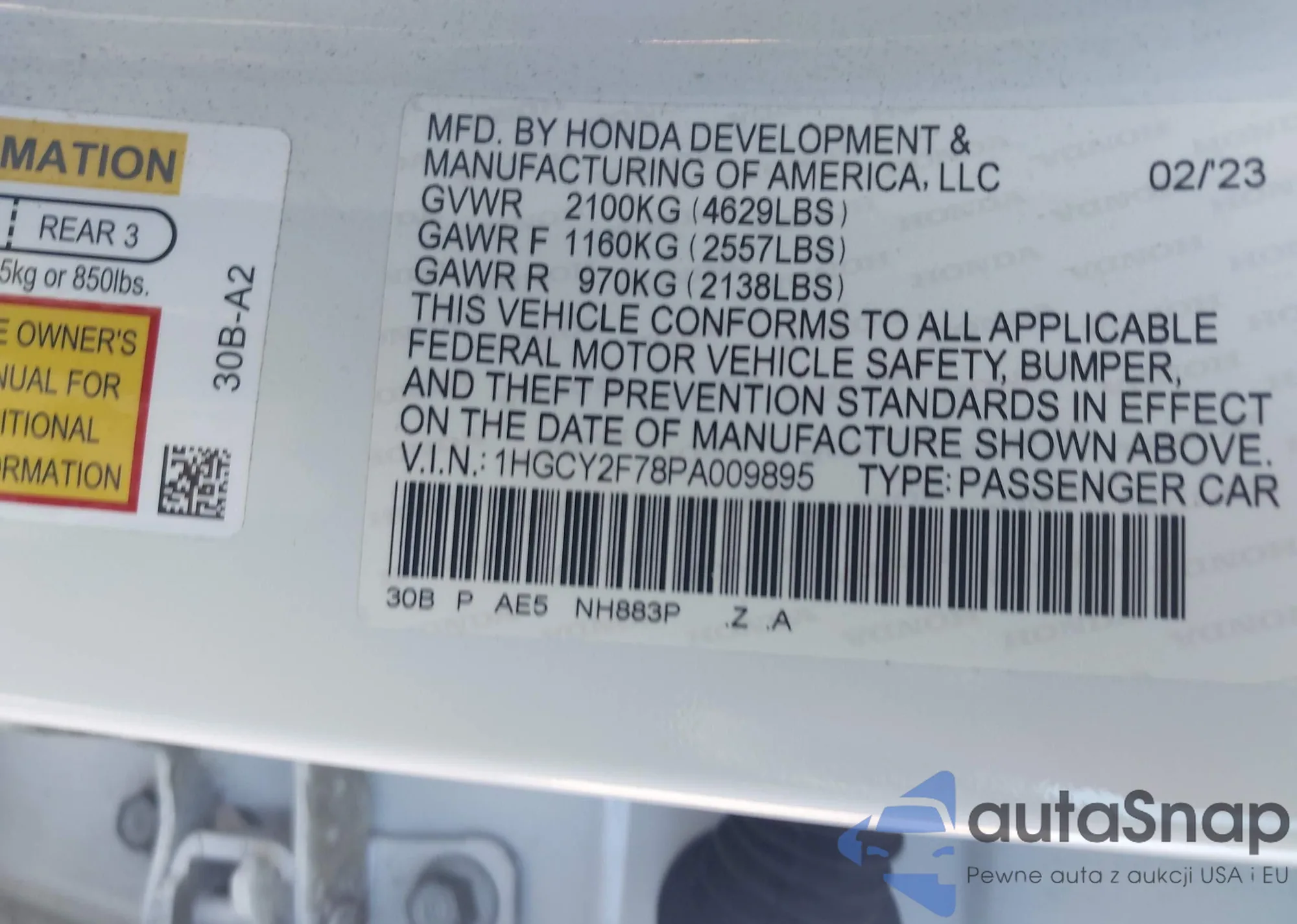 LOT: 43457803 VIN: 1HGCY2F78PA009895