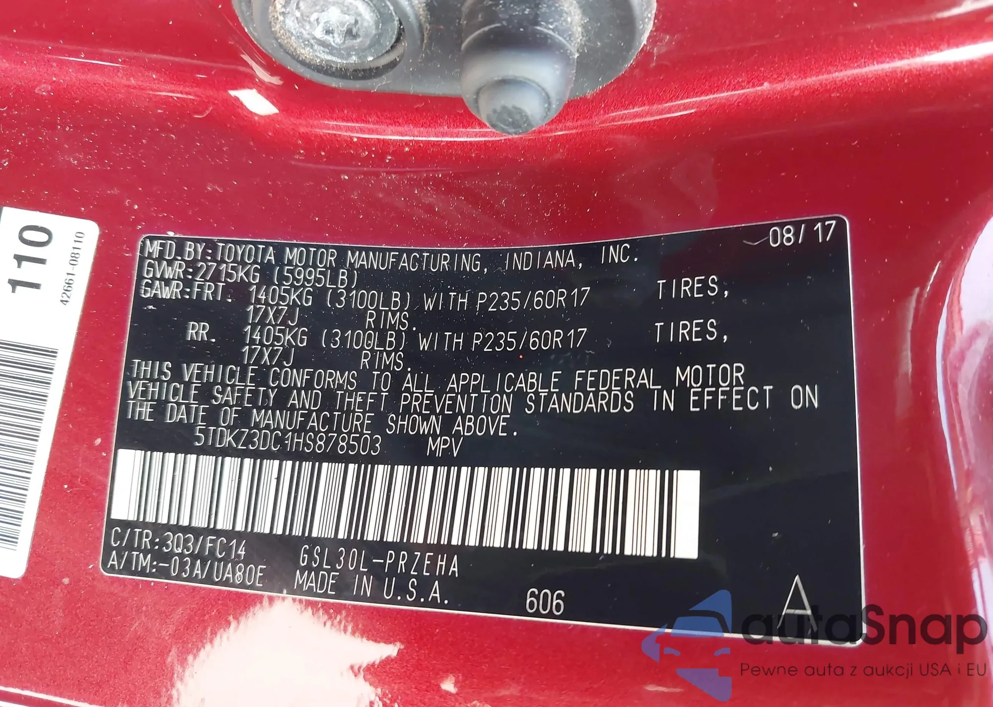 LOT: 43943733 VIN: 5TDKZ3DC1HS878503