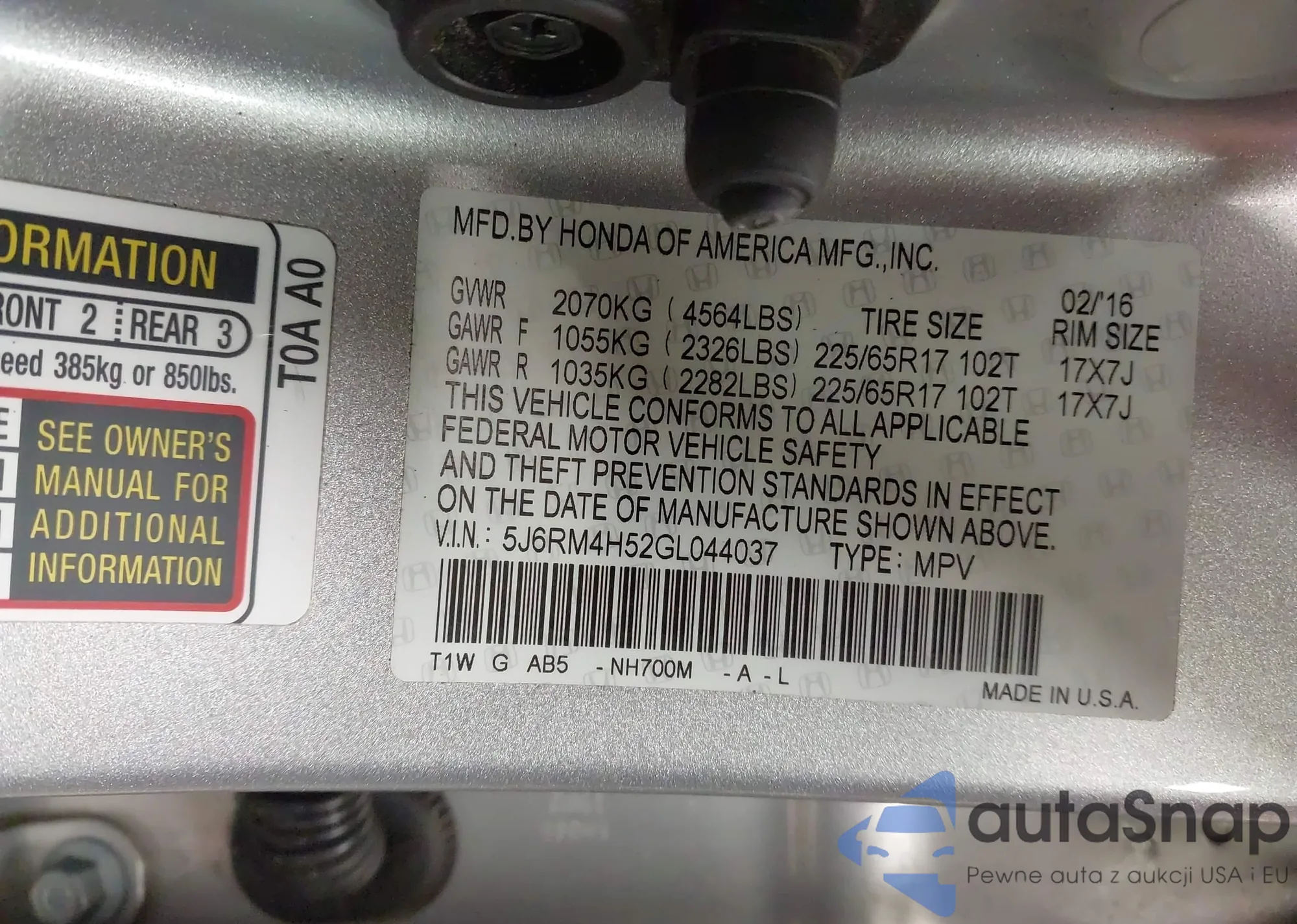 • VIN 5J6RM4H52GL044037