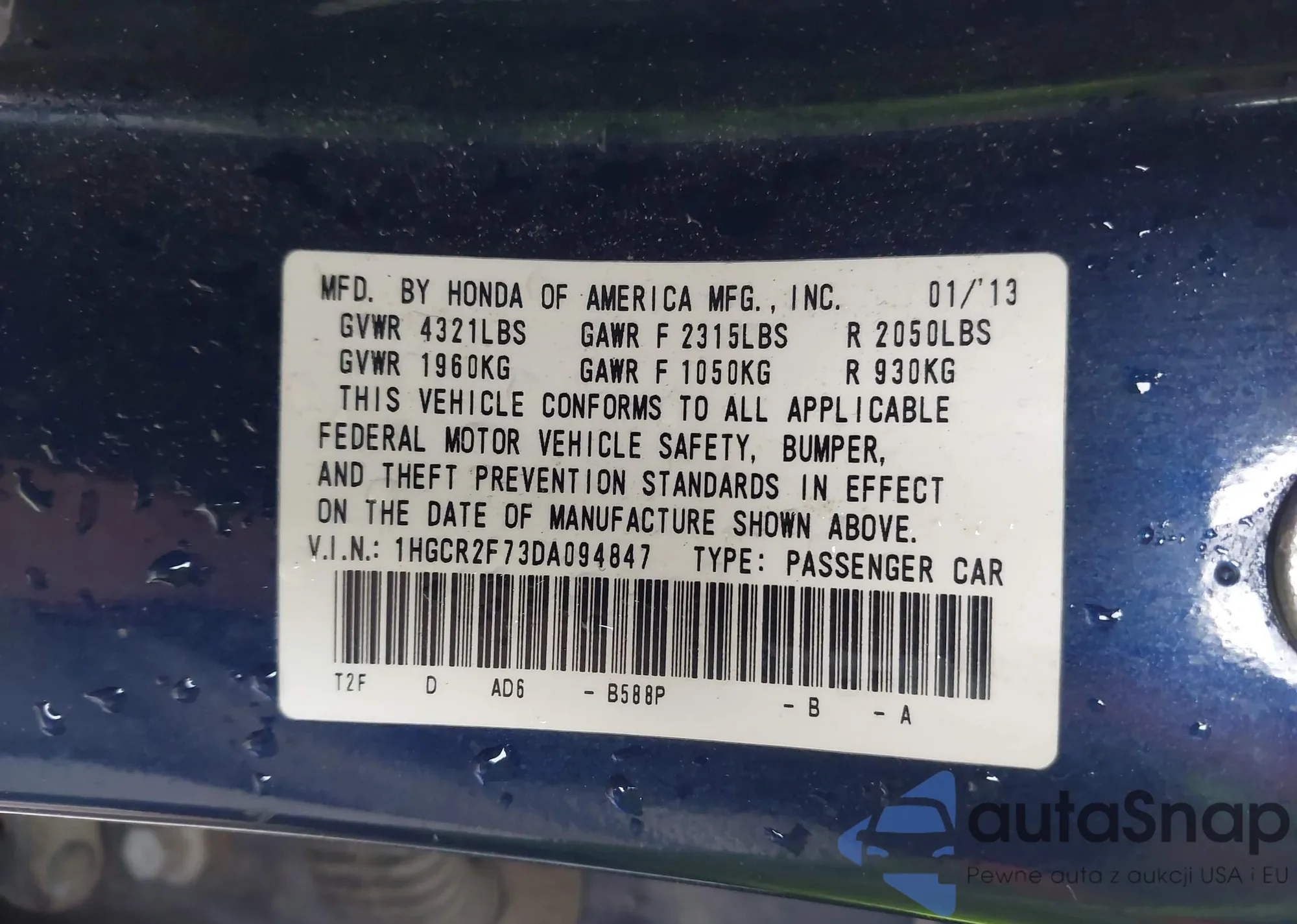 LOT: 43765291 VIN: 1HGCR2F73DA094847