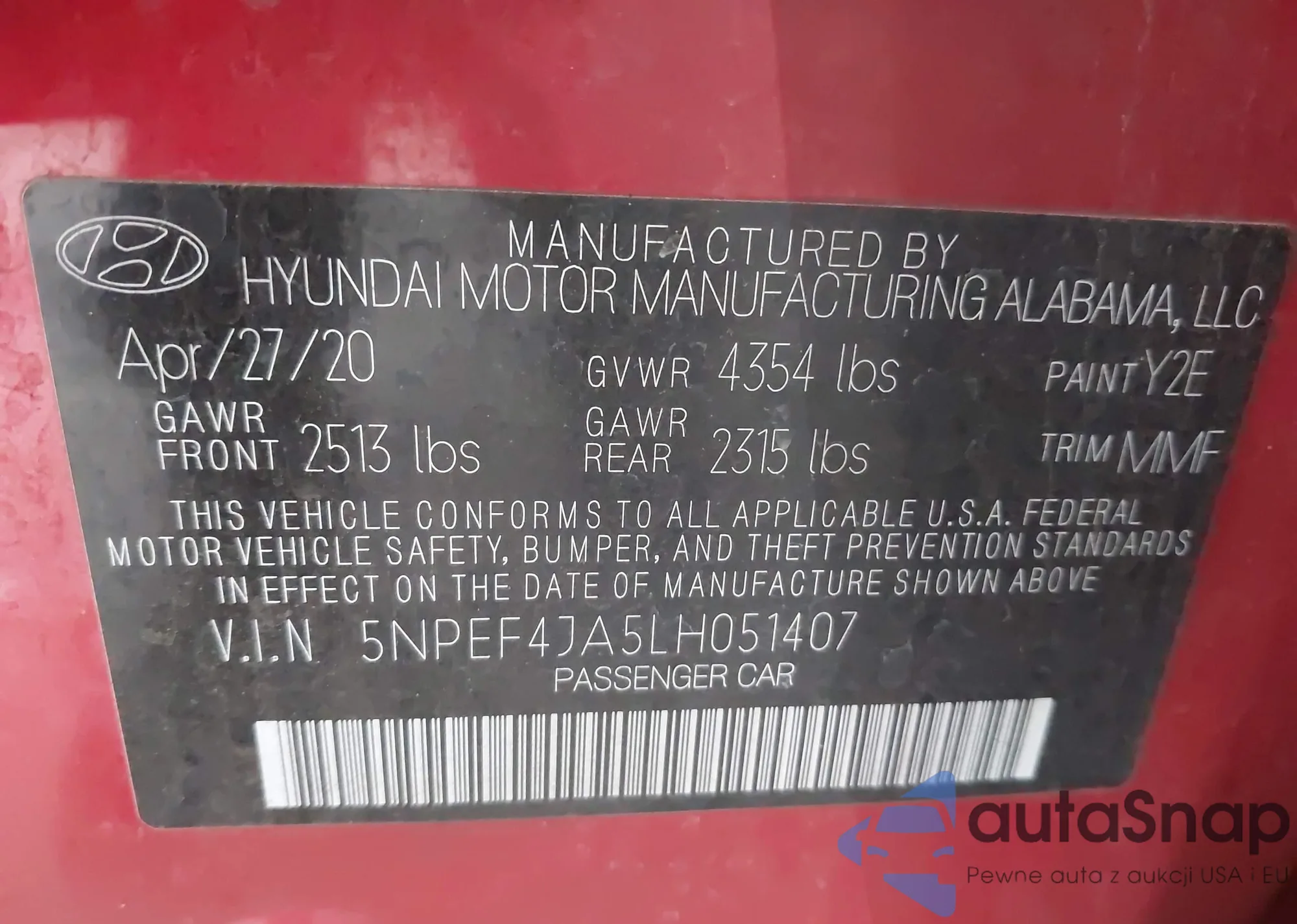 • VIN 5NPEF4JA5LH051407