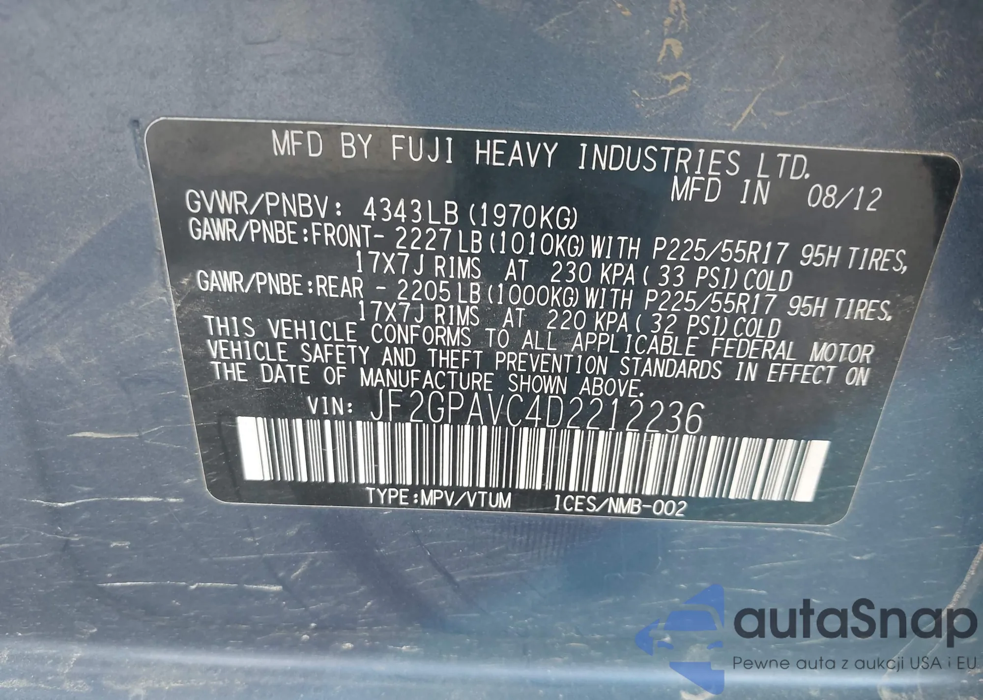 LOT: 43445429 VIN: 5J6RM4H50CL076060
