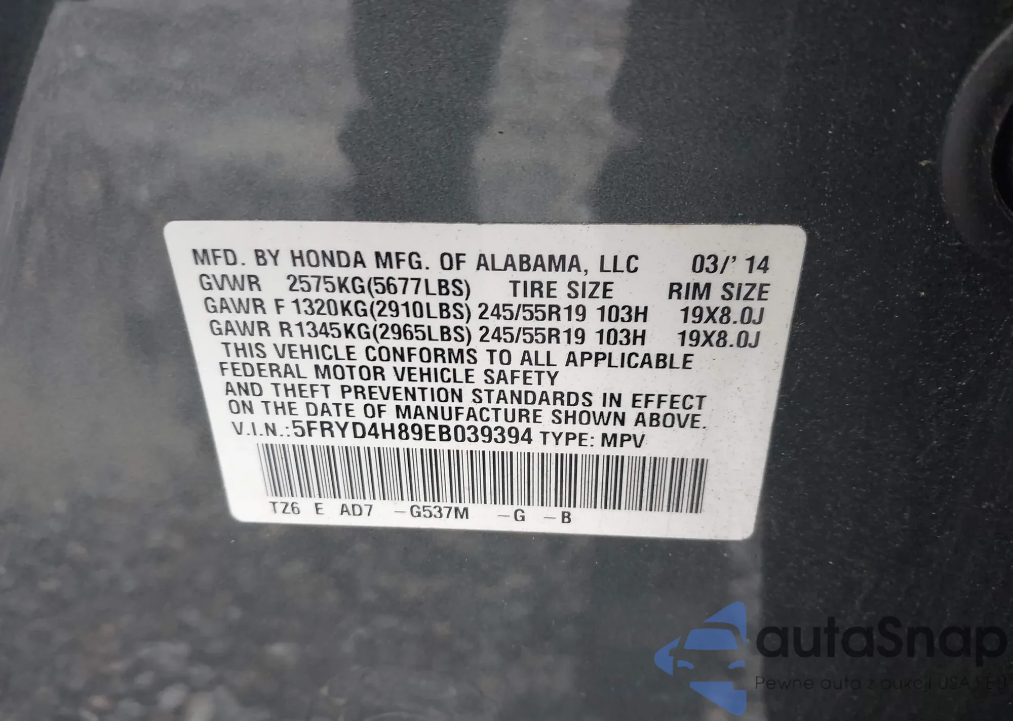 • VIN 5J6RM4H50CL076060