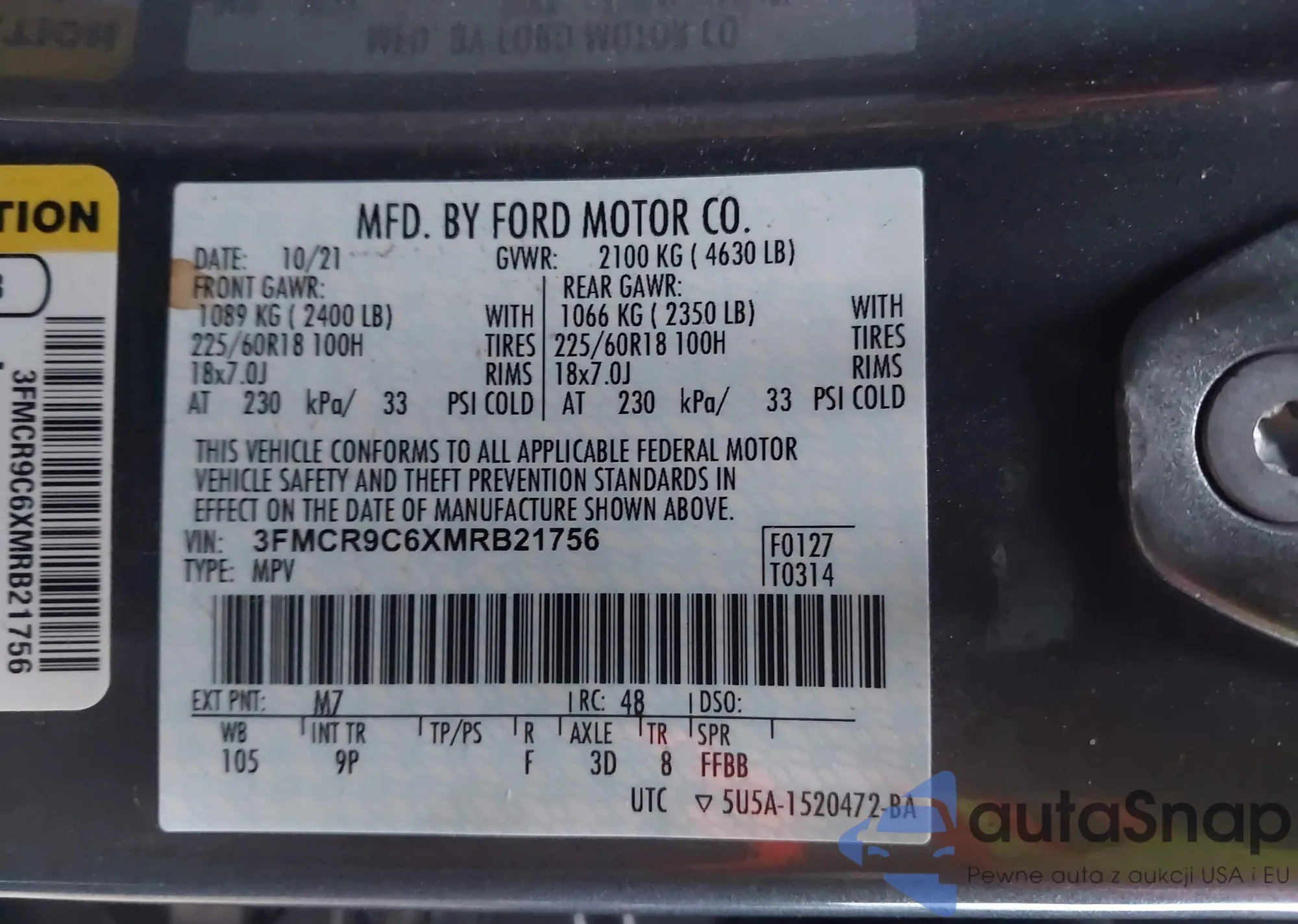 • VIN 3FMCR9C6XMRB21756
