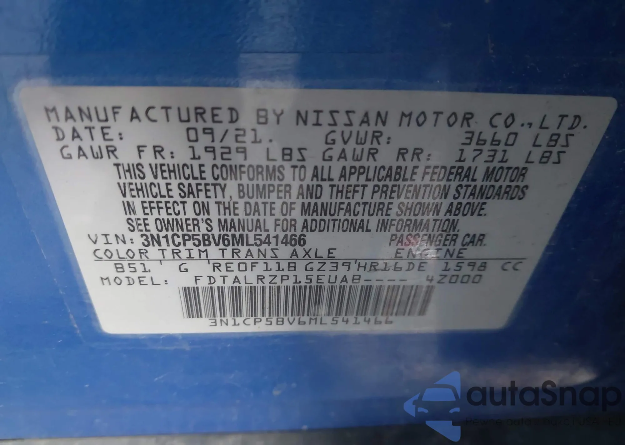 • VIN 3N1CP5BV6ML541466