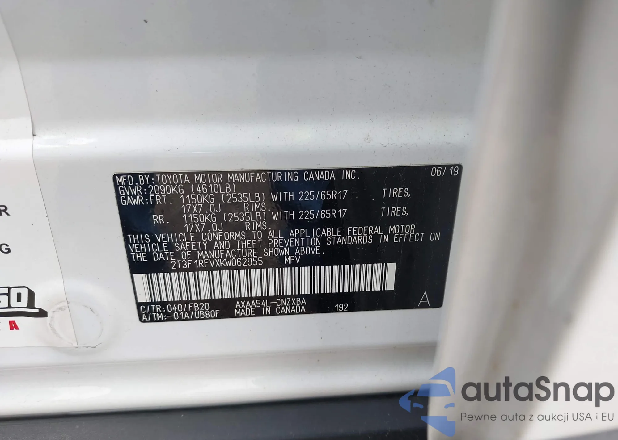 LOT: 43015624 VIN: 2T3F1RFVXKW062955