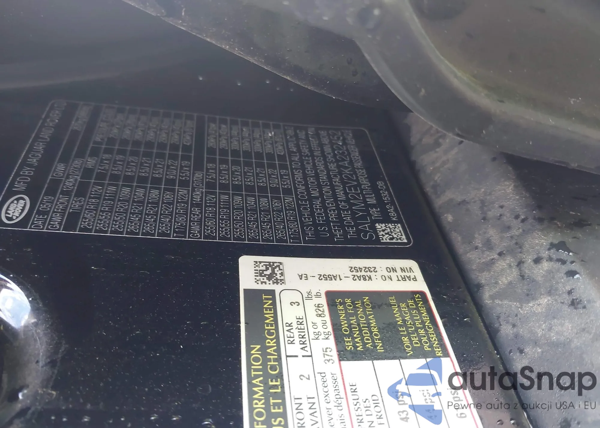 LOT: 43736583 VIN: 5J8YD7H78JL001299