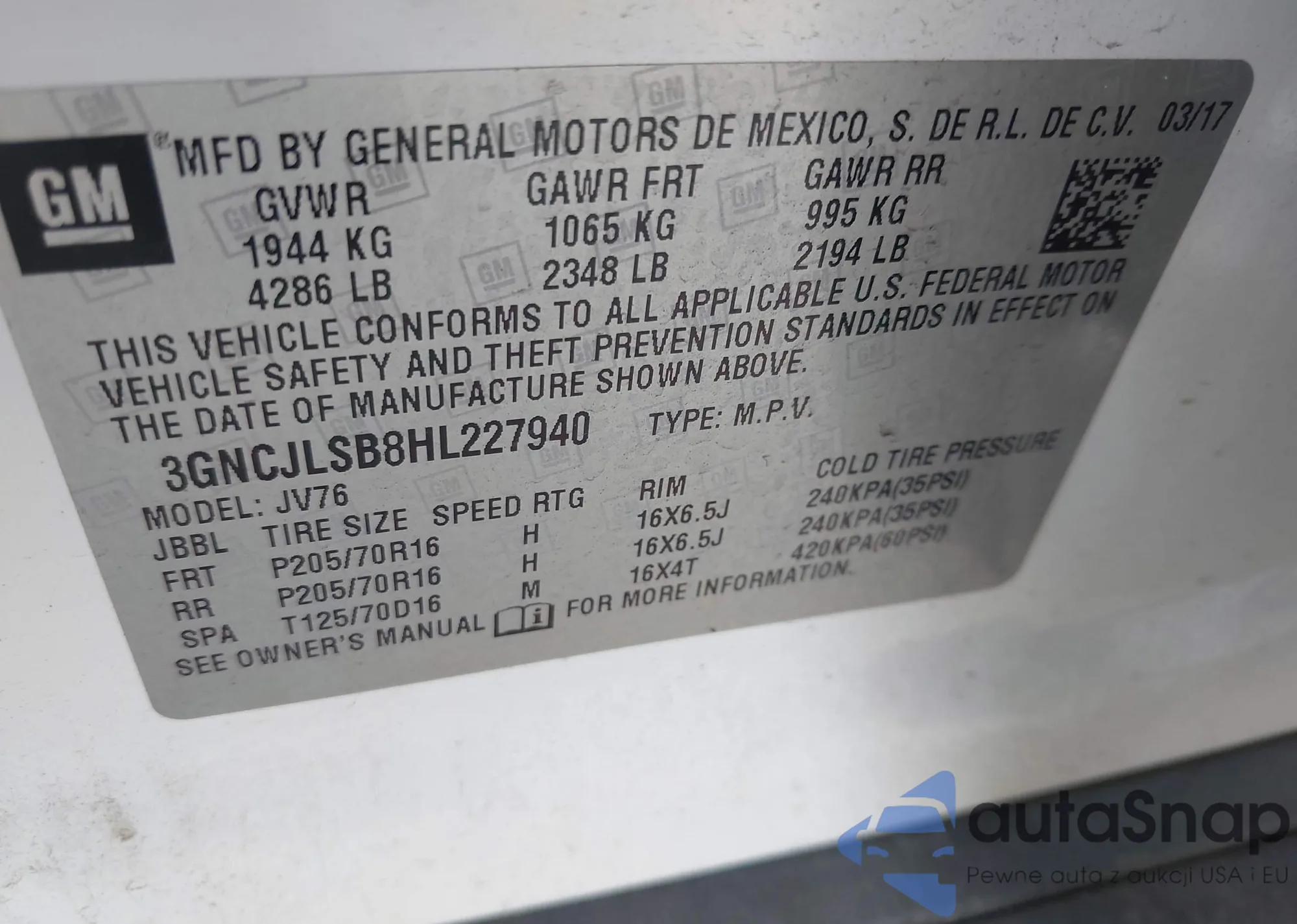 • VIN 3GNCJLSB8HL227940