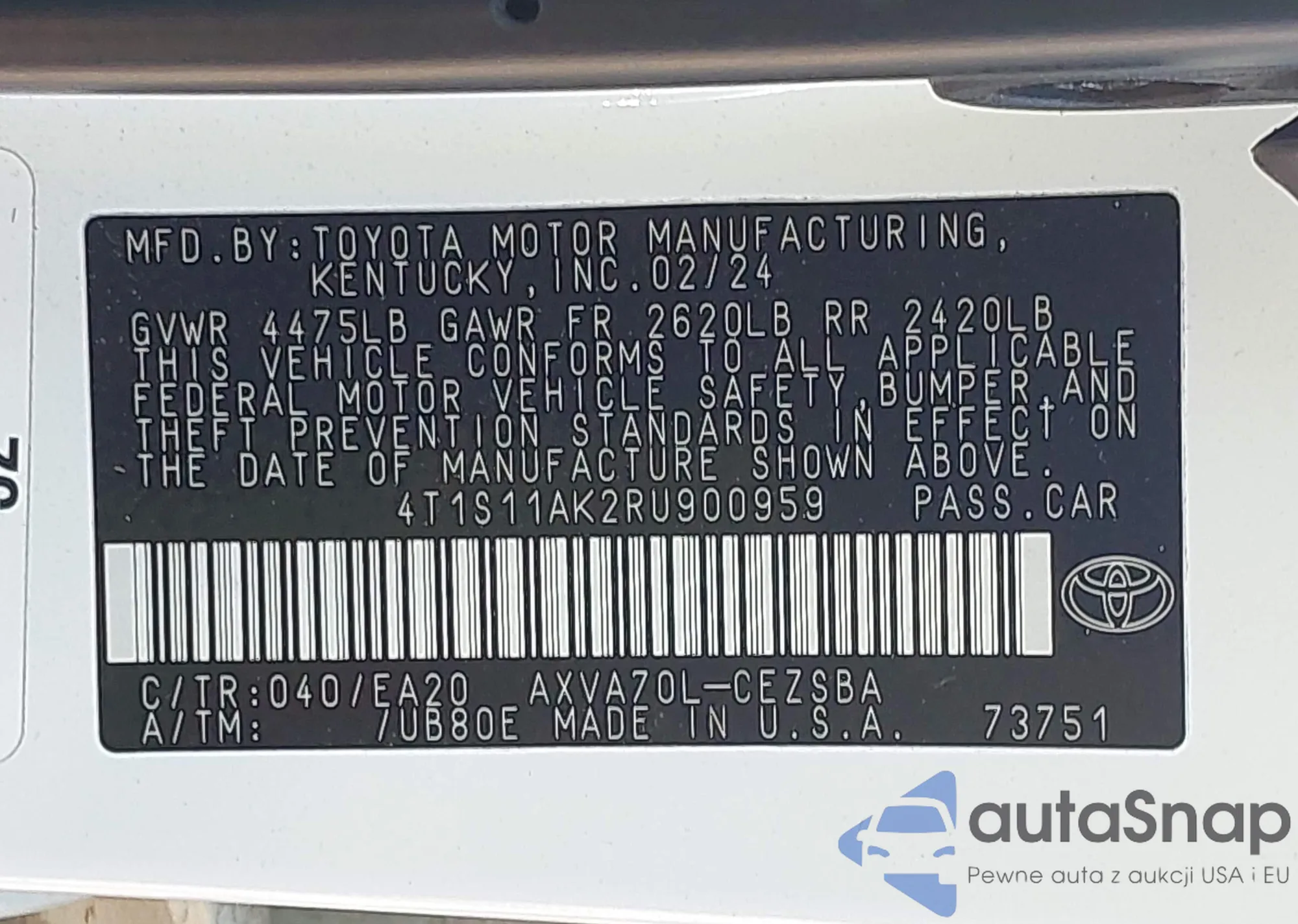 • VIN 4T1S11AK2RU900959