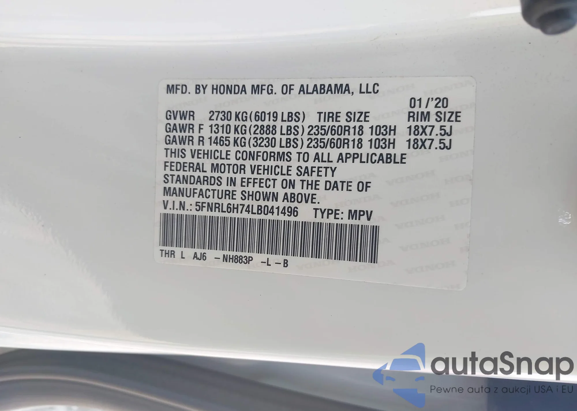 • VIN 5FNRL6H74LB041496