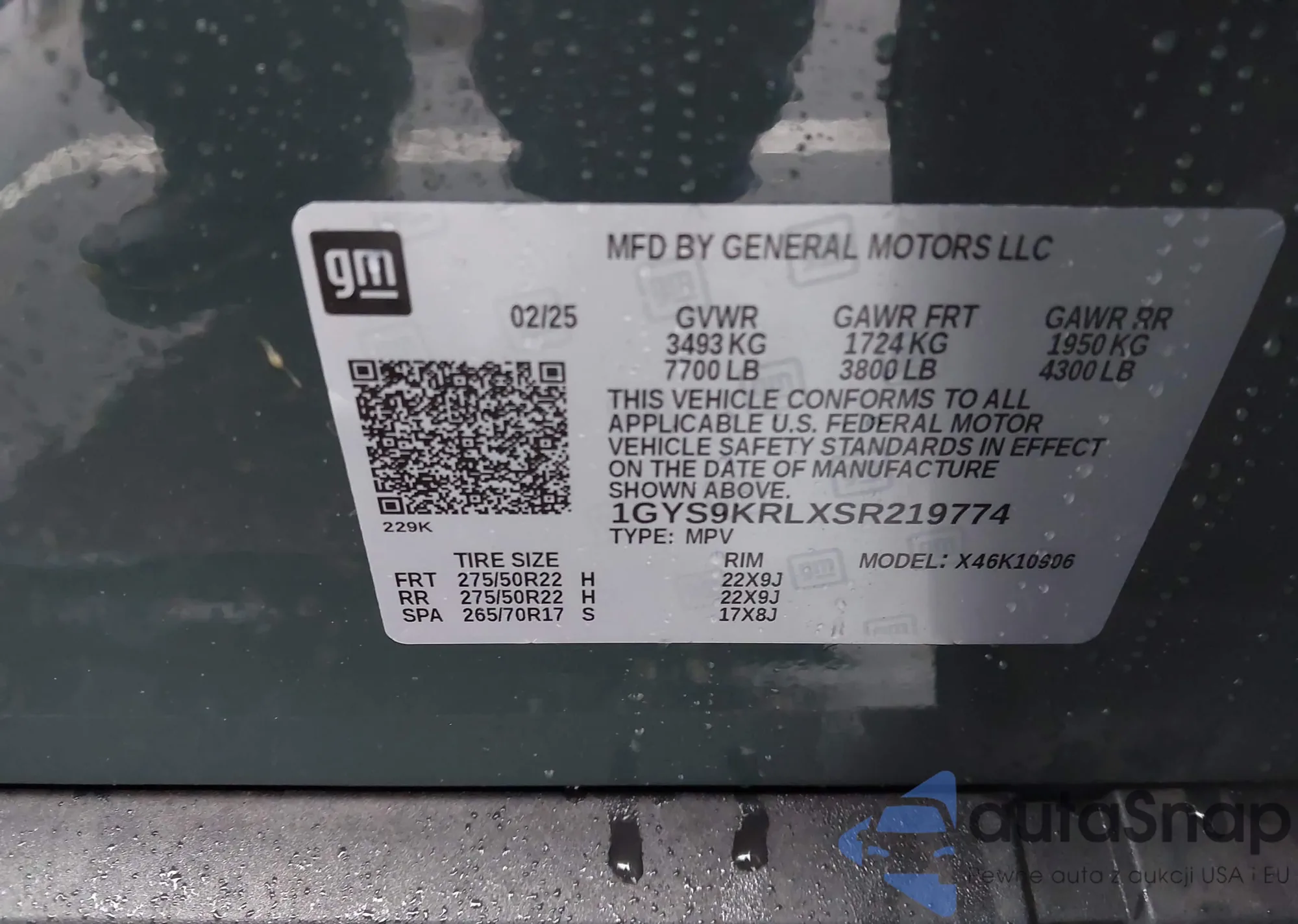 • VIN 1GYS9KRLXSR219774