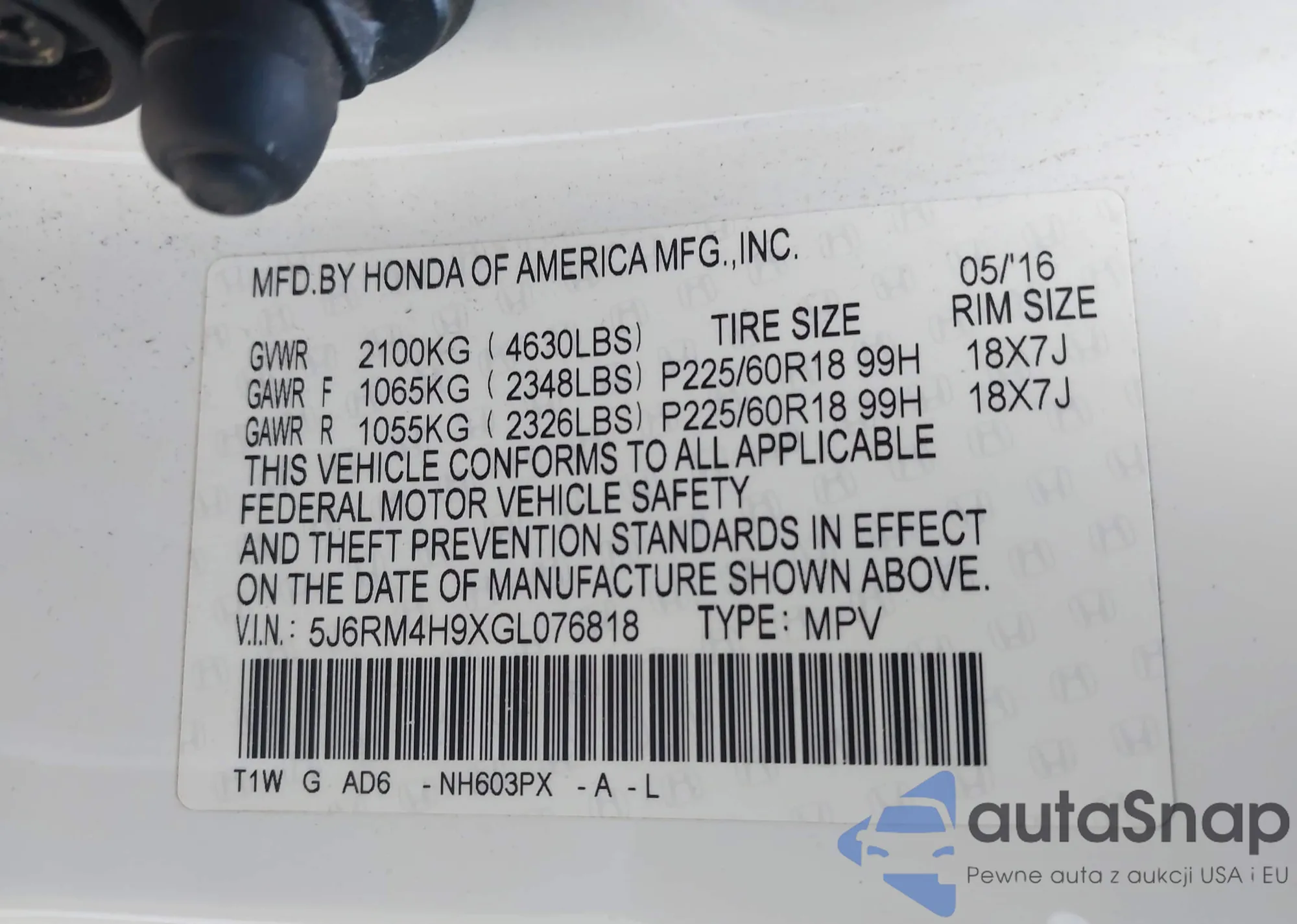 • VIN 5J6RM4H9XGL076818