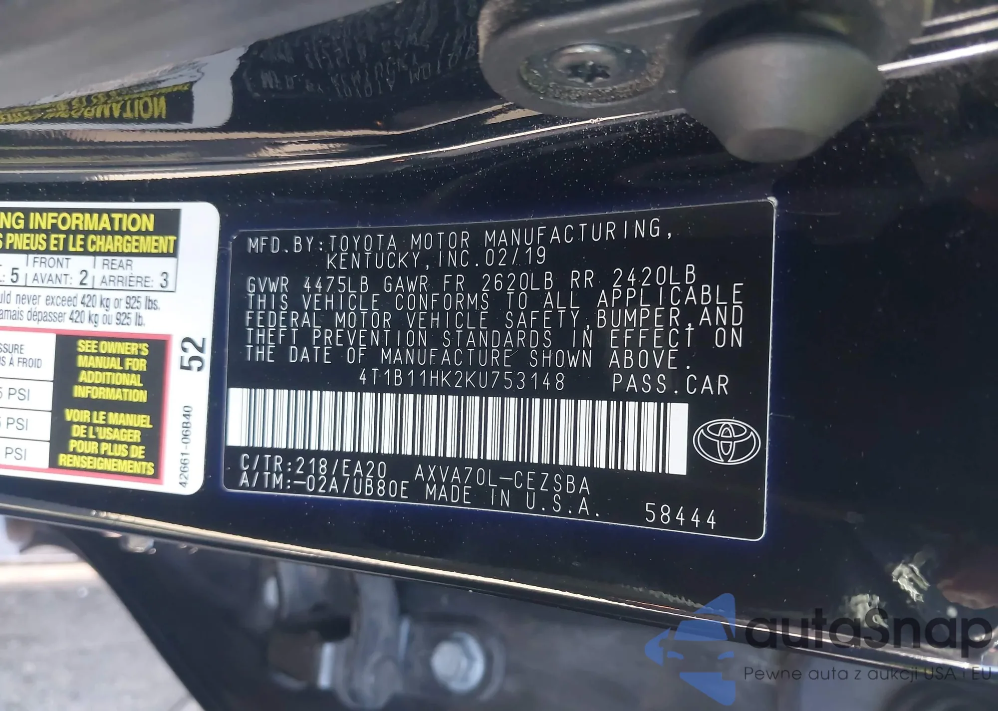 • VIN 4T1B11HK2KU753148