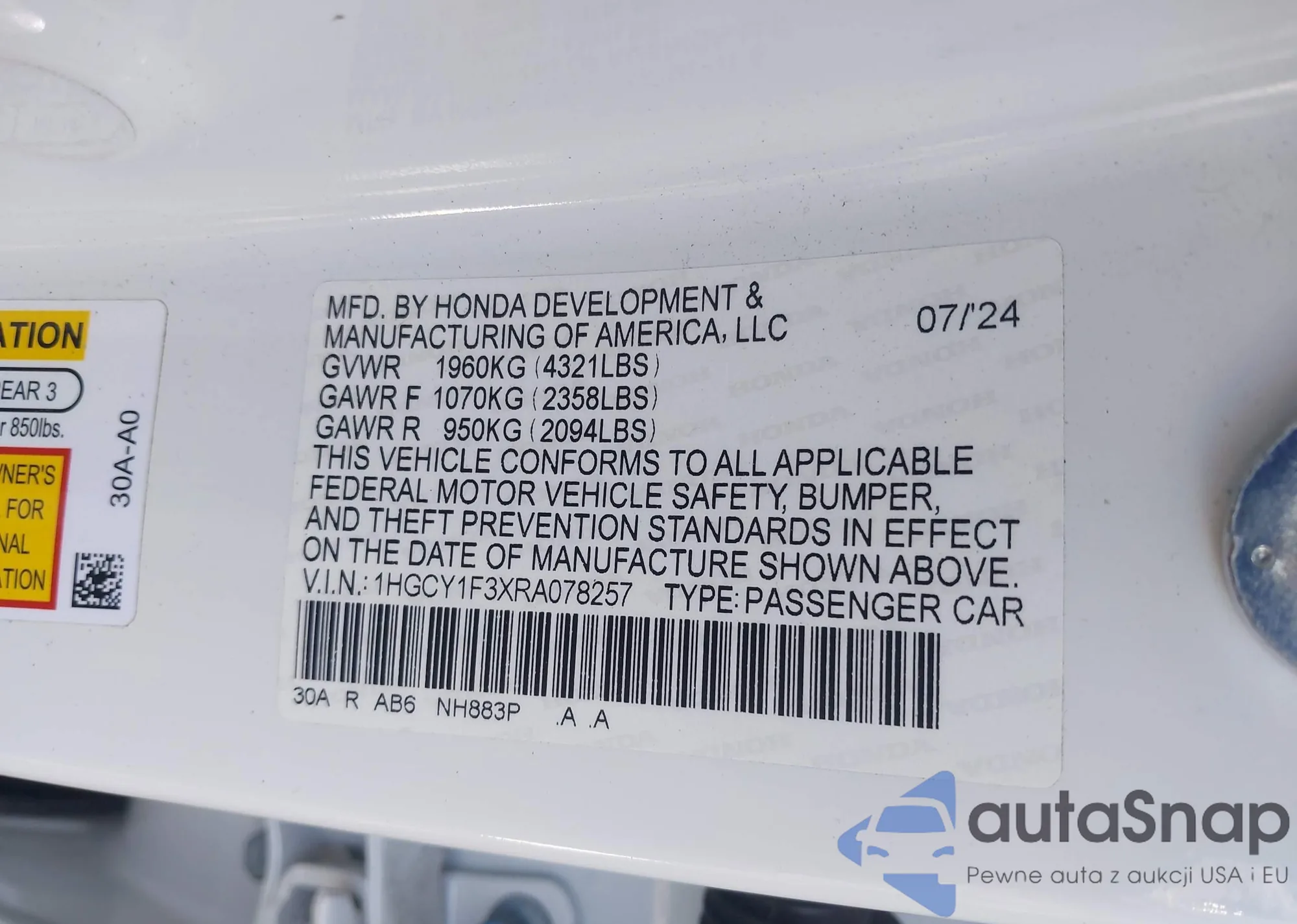 LOT: 43602081 VIN: 1HGCY1F3XRA078257