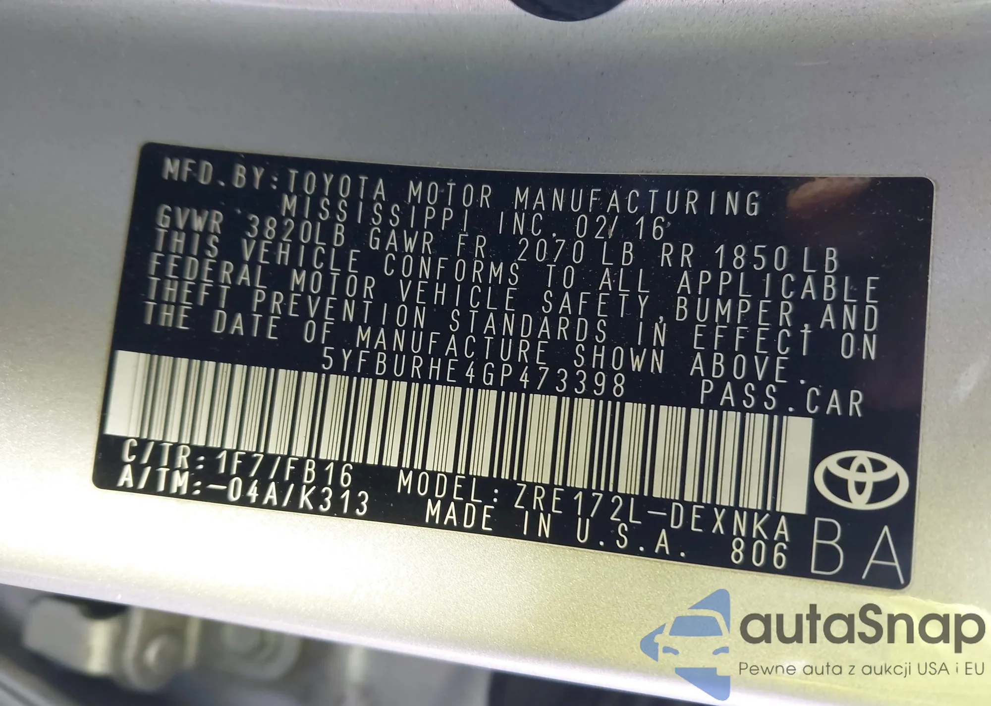 • VIN 5YFBURHE4GP473398