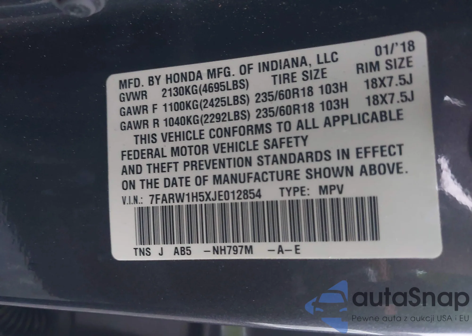 • VIN 7FARW1H5XJE012854
