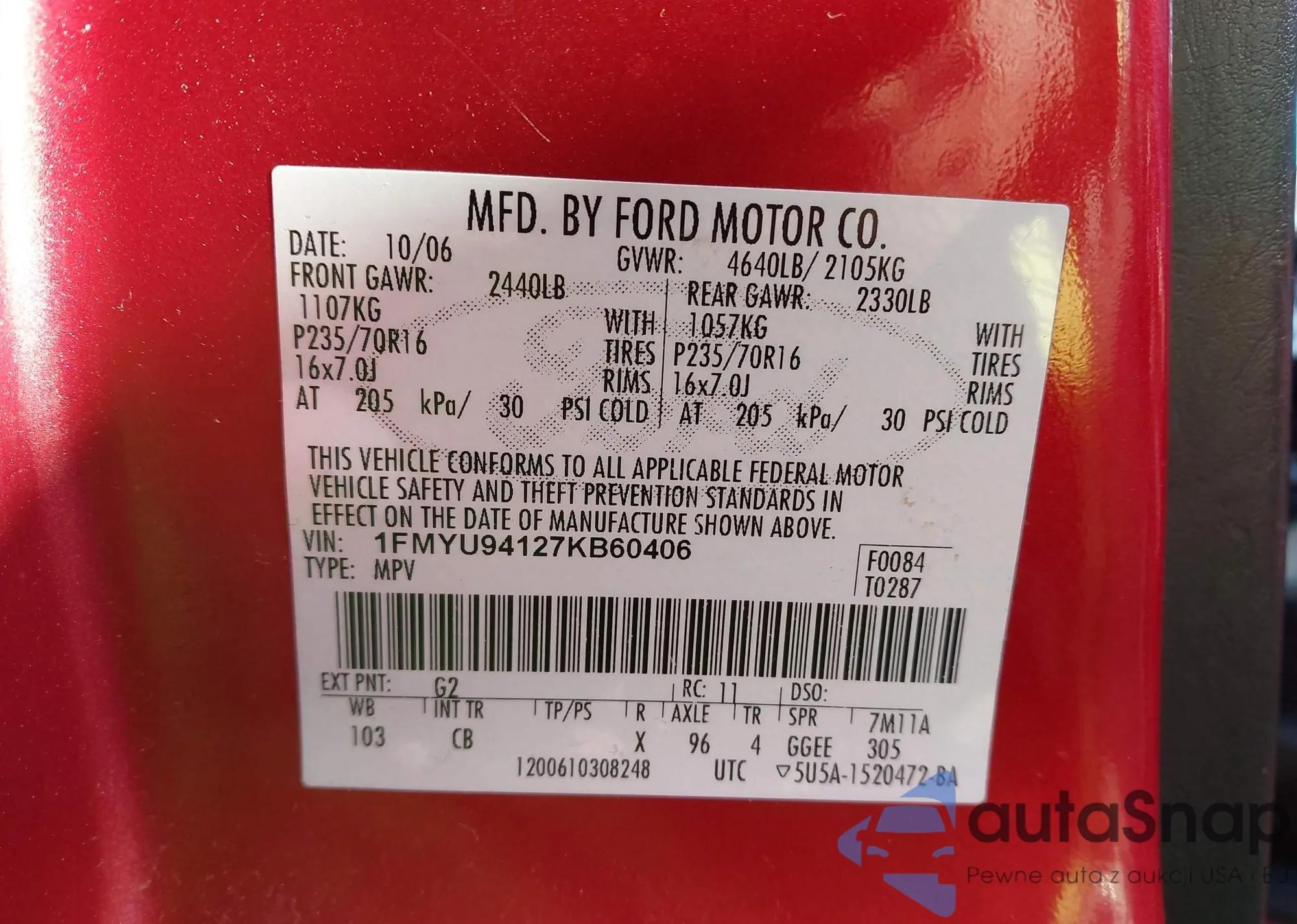 LOT: 43727457 VIN: 1FMYU94127KB60406