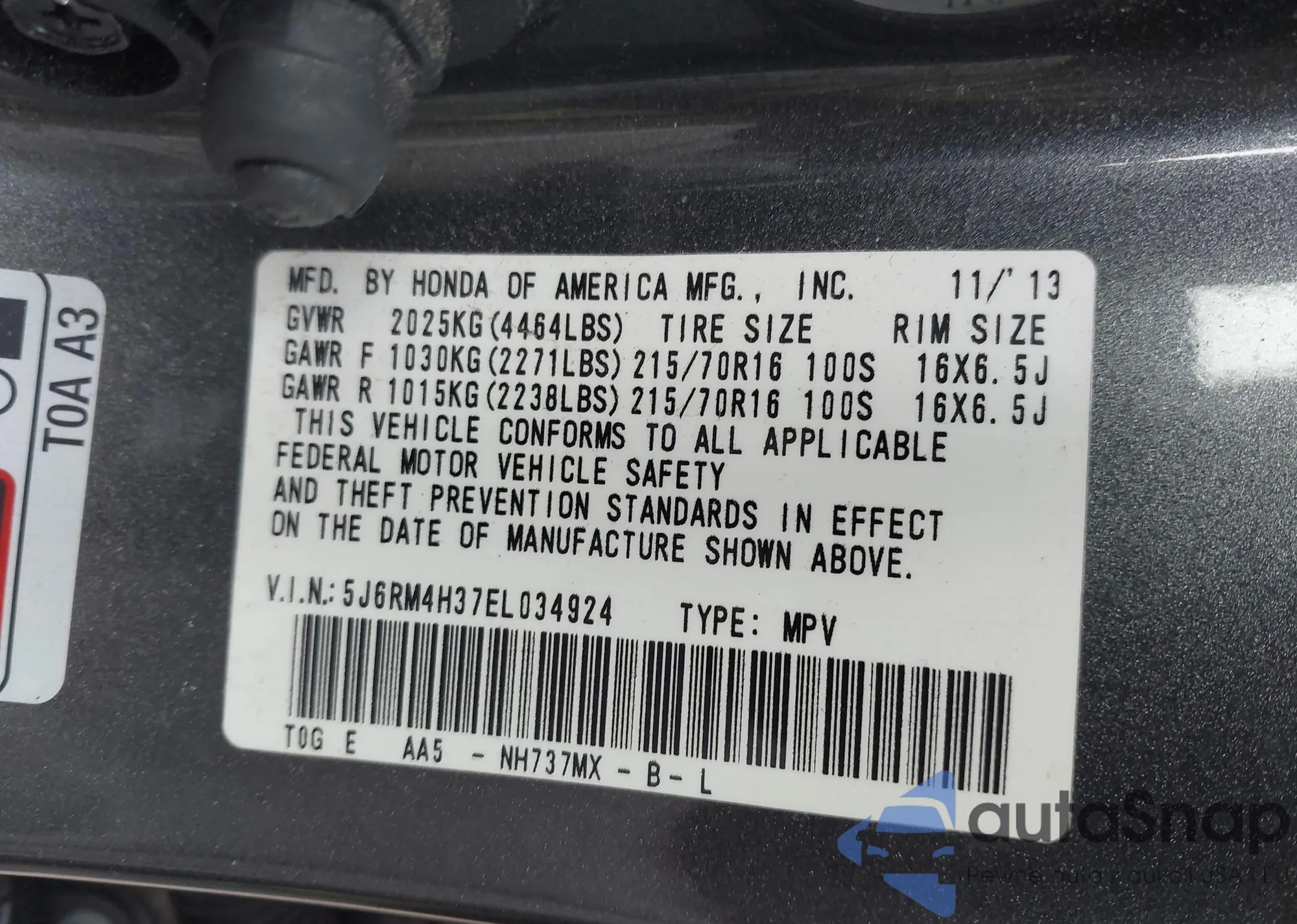 • VIN 5J6RM4H37EL034924